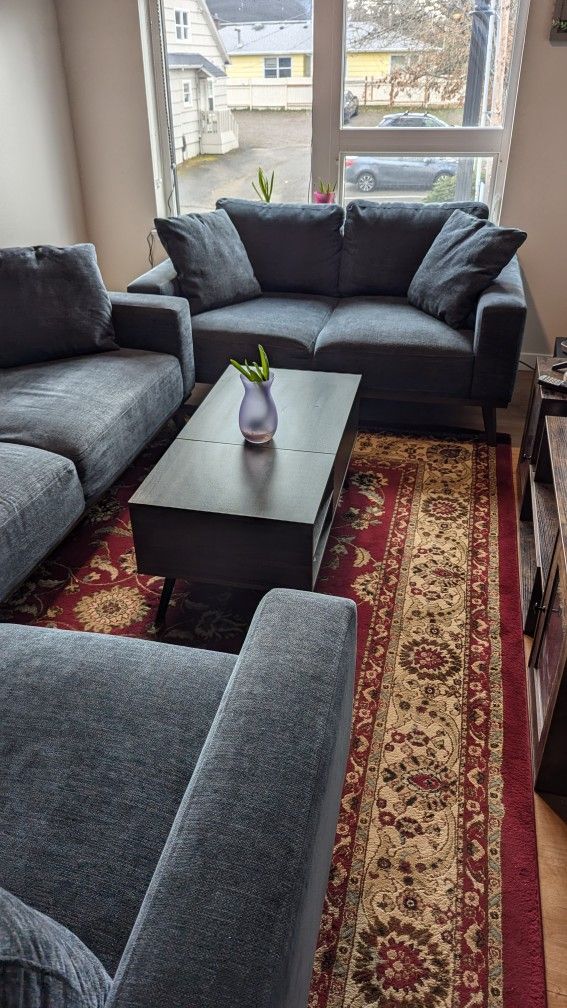 Everything is good and clean not damaged the furniture is old 10 months. If you interested text me you can come check I live in Beaverton coffee table olso is good.