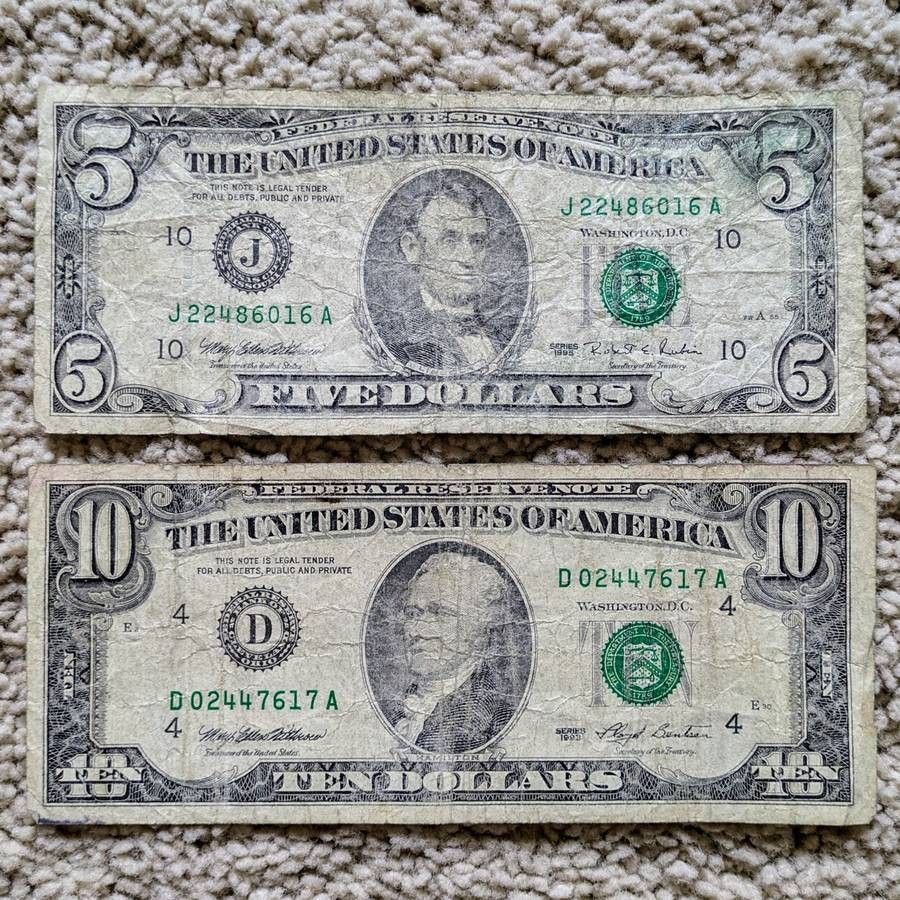 Vintage 1990s small face $5 & $10 bills Federal Reserve bank notes old American paper money
