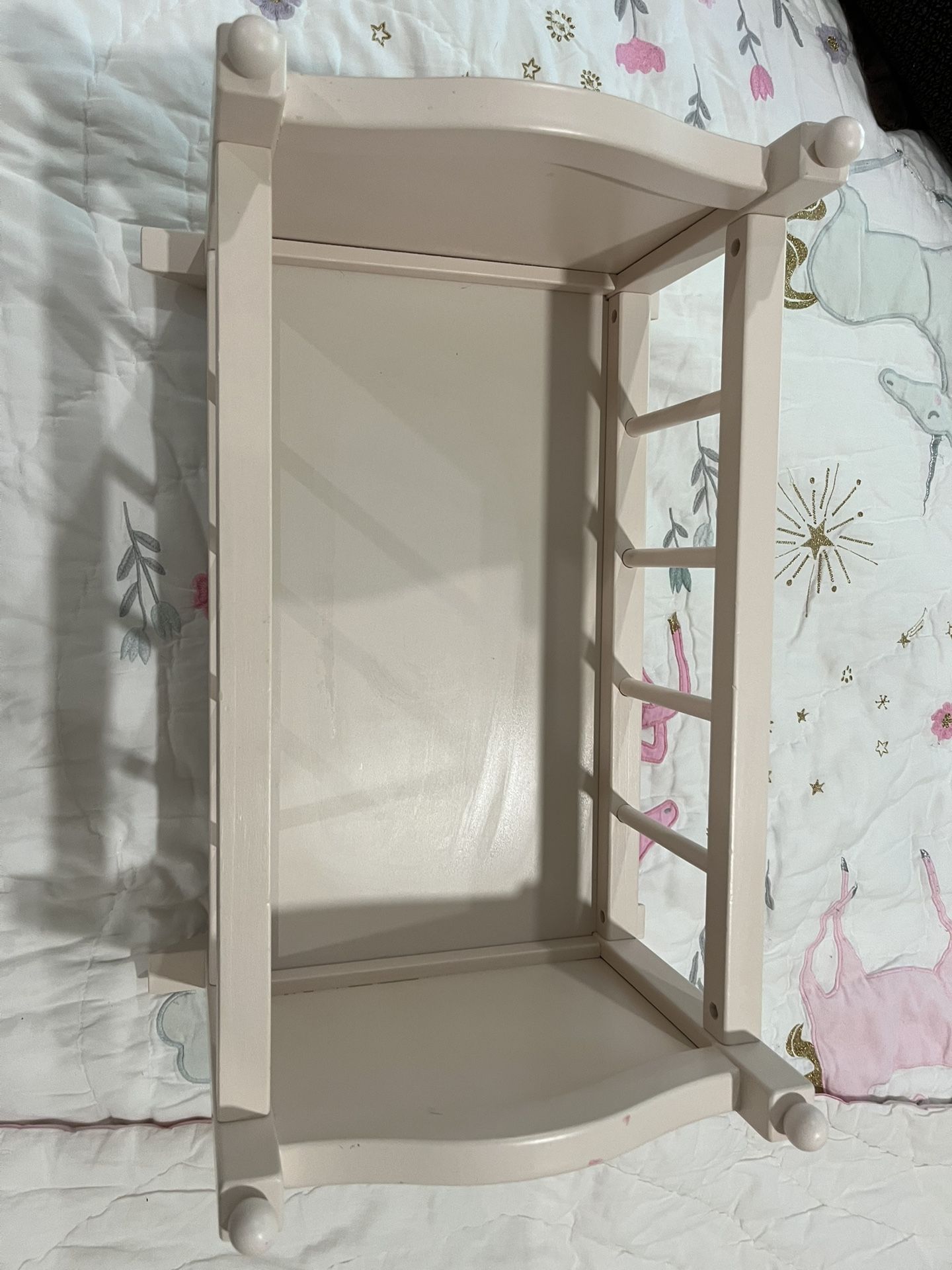 Pink baby doll cradle. This is a great cradle. My kids loved tucking their baby dolls or stuffies in at night. There is some left over sticker on one side, see photo. Just needs some soap to get it off.