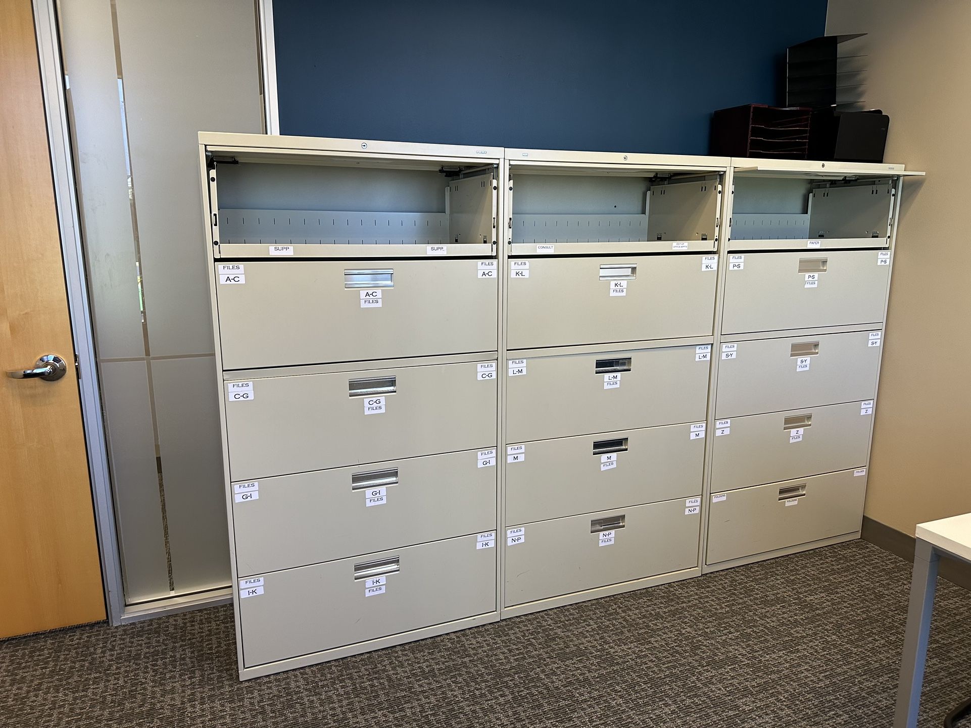 *Please read completely* HELLO We have lots of lateral file cabinets available in various colors styles and sizes. We have 2 drawer, 3 drawer, 4 drawer and 5 drawer available. Our inventory changes every month so please message me for current inventory or you can visit us in Rancho Cucamonga Ca. 2 drawer is $125 3 drawer is $150 4 drawer is $175 5 drawer is $200 MESSAGE me to schedule a PICK UP or to set up a DELIVERY (for a charge) THANK YOU, James lockers file cabinets filing cabinets glass boards flat files supply cabinets training tables storage shelves used office desks used office chairs client chairs lobby chairs book cases carts