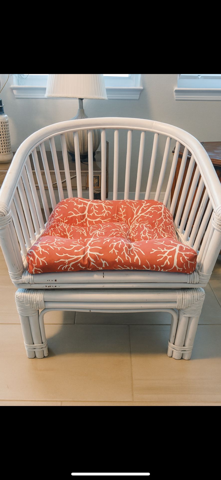White rattan chair with red coral-print cushion. Sturdy and stylish. • $18 firm • Local pick-up only • Cash only 📍Lady Lake / The Villages