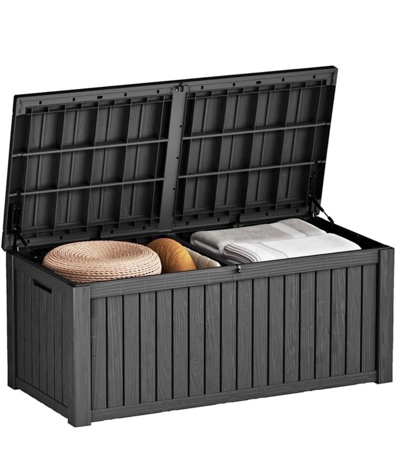72-Gallon Weatherproof Outdoor Storage Box with Woodgrain Finish - Black Resin