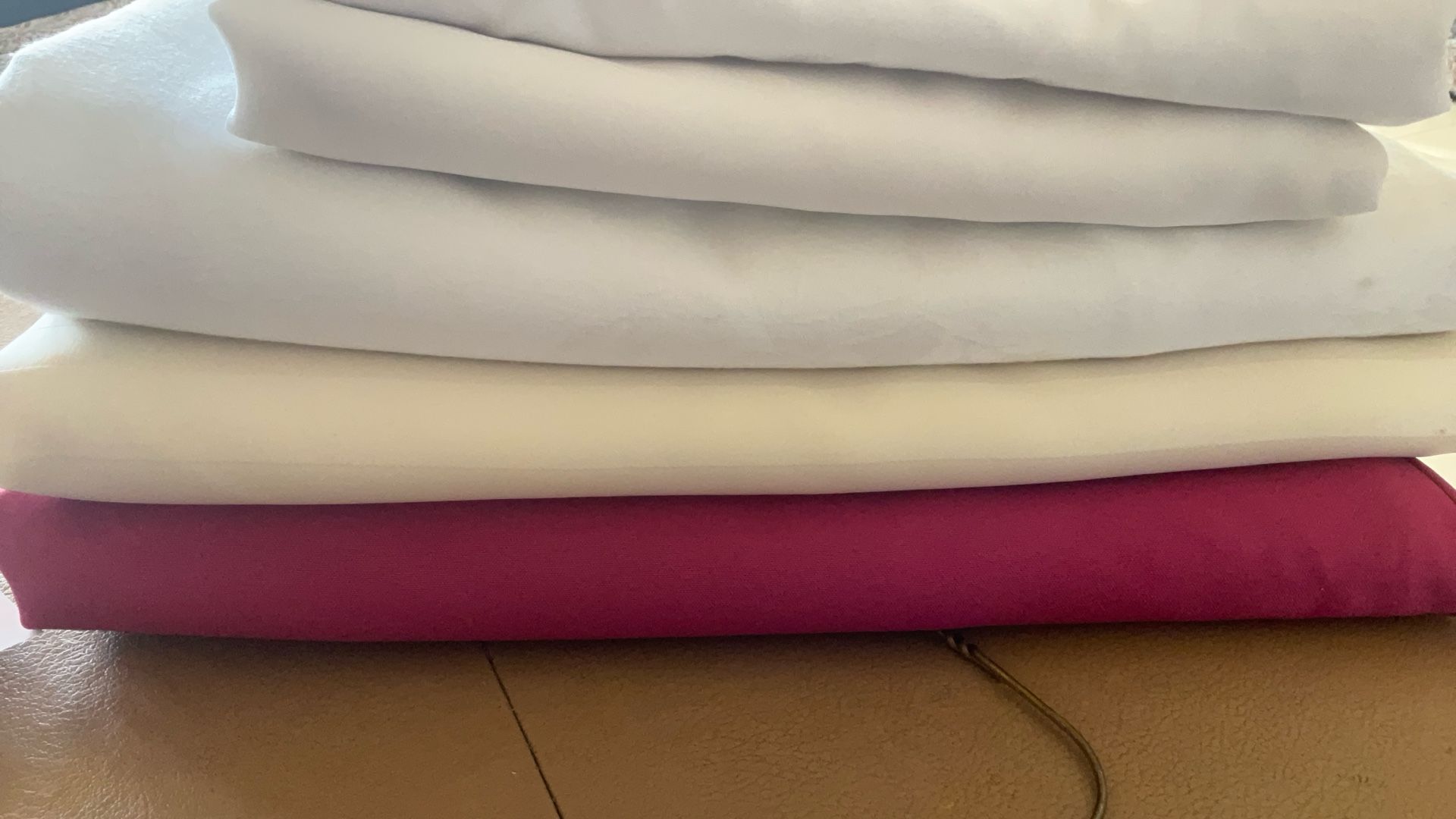 2 90”Round White Tablecloths. 2 White $7.00 each. And 3 120” Round Table Clothe White, Cream and Dark Pink $15.00 each