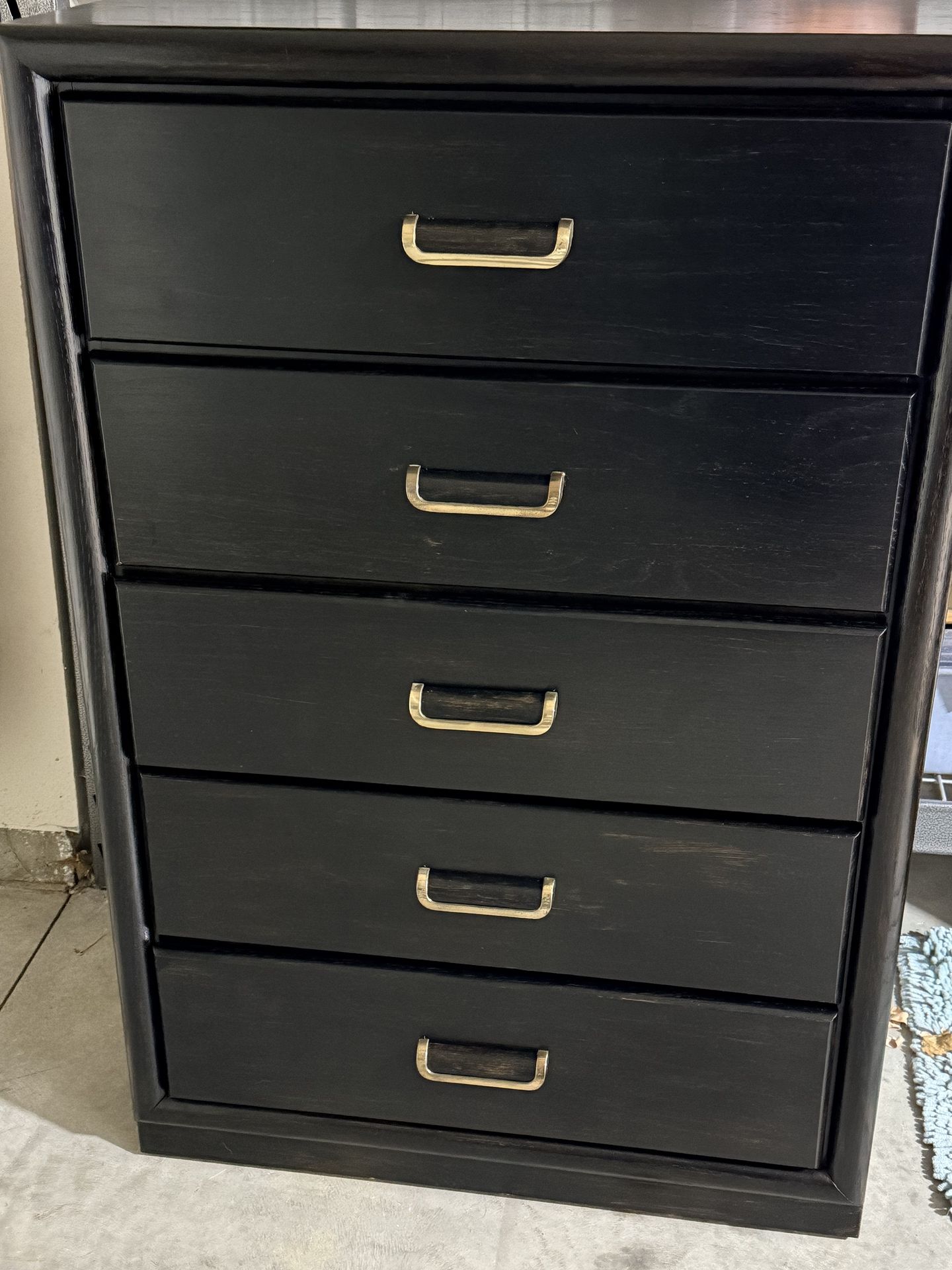 The dresser is made of wood with a rich, carbon black finish. It features a simple, classic design with five vertically stacked drawers, picture-frame paneling. In like new condition! All drawers slide well. Oak highboy measures: 30.5” Wide × 17” Deep × 46” Tall. Pick up in Meridian off of Eagle & Overland Rd Vintage MCM Mid Century Modern Scandinavian Art Deco Highboy