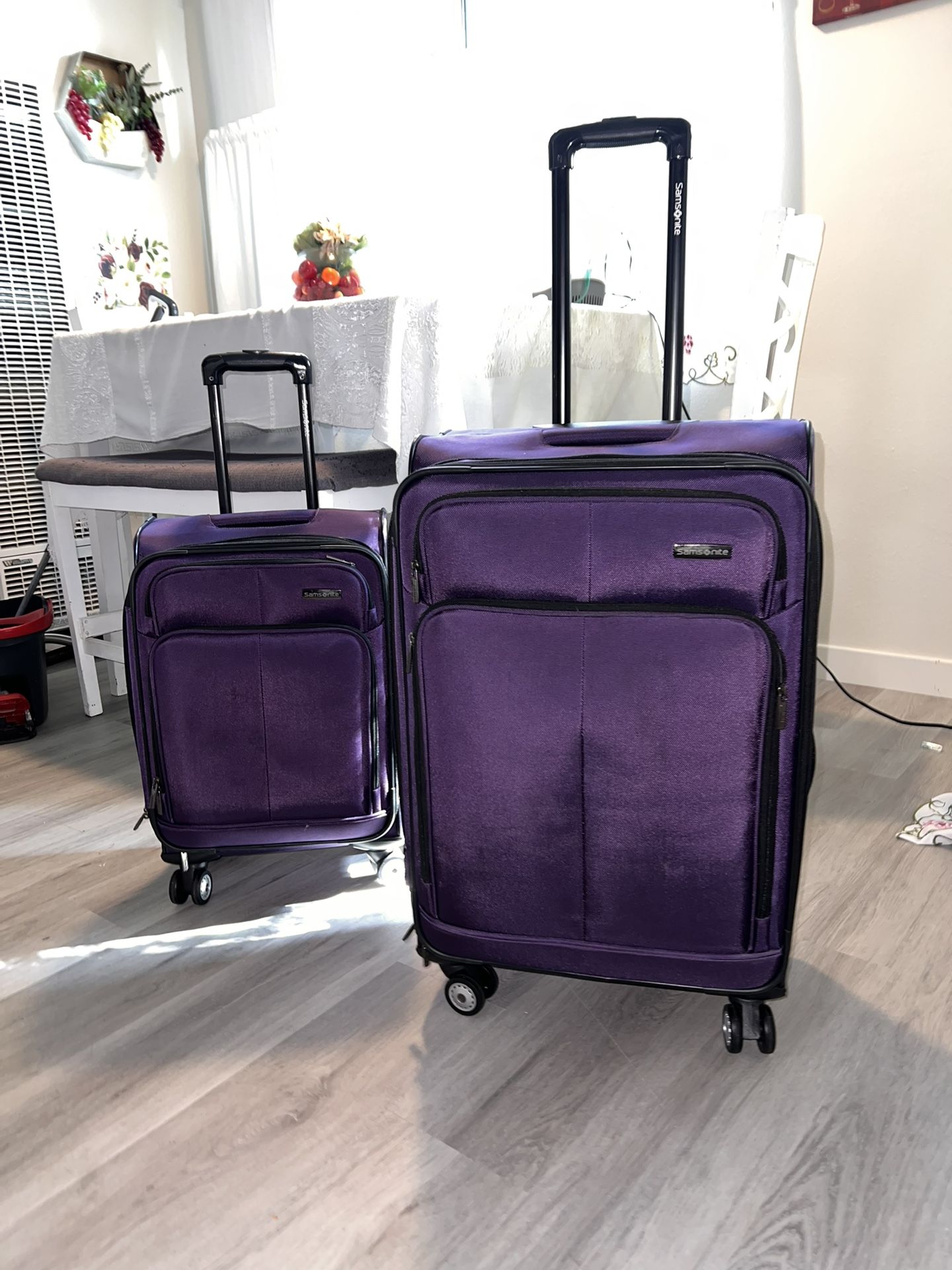 Purple travel Luggage, great condition! Handle can give a bit of trouble if case is too heavy but only used them a few times.