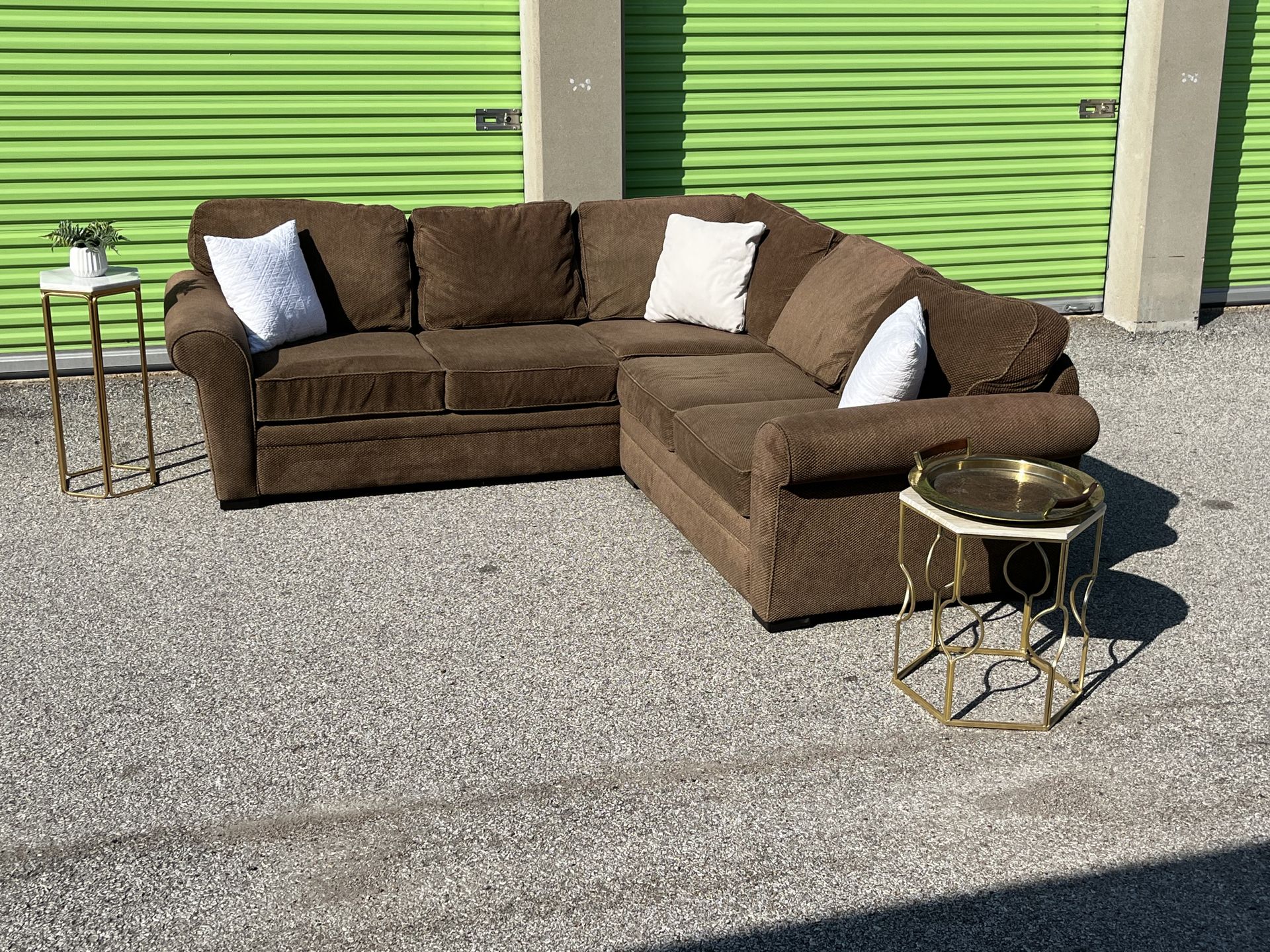 Brown sectional sofa in good condition. Comfortable and spacious, perfect for living rooms or basements. From a pet-friendly home. Dimensions: 96” x 97” Asking $500. Pickup is free, or delivery available for a small fee.