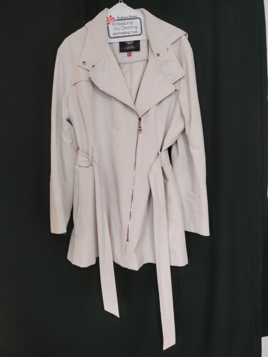 Vince Camuto Ladies Hoody/Zipper/Belt-tie Coat; hardly used and recently dry-cleaned. Color: Ivory Size : XXL Removable Hoody, Zip-up and Belt-tie Coat Measurements: Front Length: 34" (flat, neck/shoulder to bottom trim) Sleeves: 26" / Sleeve Opening: 6" (flat, closed zipper) / Beceps: 8.5" (flat) Chest: 24" (flat across) Side Length: 22" (flat from armpit to bottom trim) Hips: 23" (flat) Shell: 66% cotton / 34% polyester Lining: 100% polyester