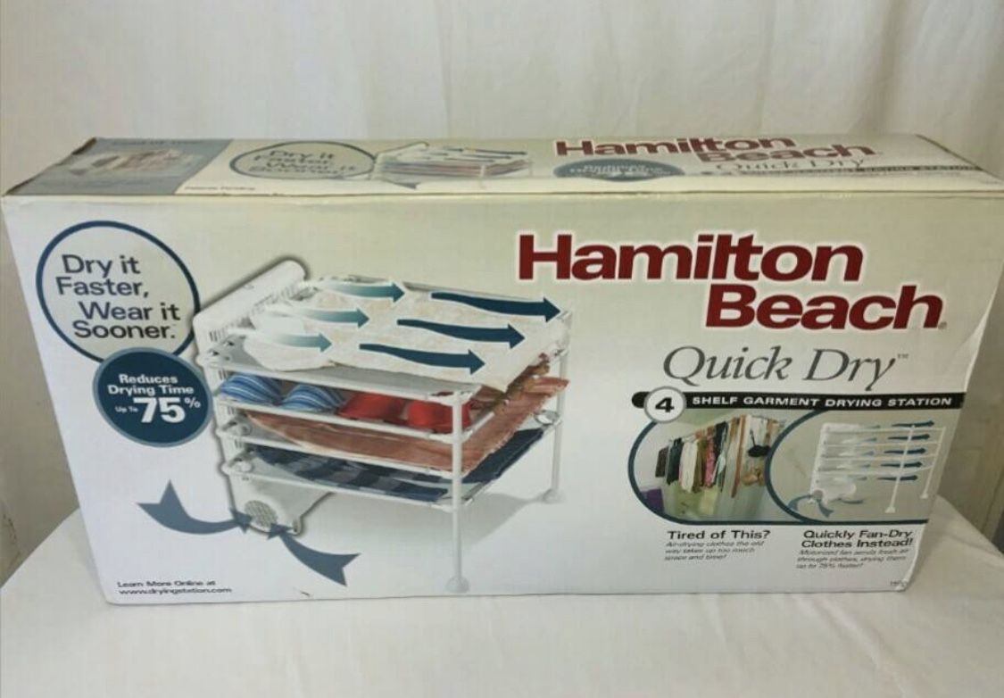 New in box, sold by original owner (never used) - Dries clothes up to 75-percent faster than air-drying - Ultra-quiet electric motor gently circulates cool room air evenly to dry garments - 4 adjustable mesh shelves accommodate even extra-large sweaters - Lightweight, space-saving design disassembles quickly for storage - Measures approximately 32 x 7 x 16 inches (Box measures 36x20x6") - weight is approximately 15 lbs. Hamilton Beach Quick Dry- Folding Garment Clothing Dryer