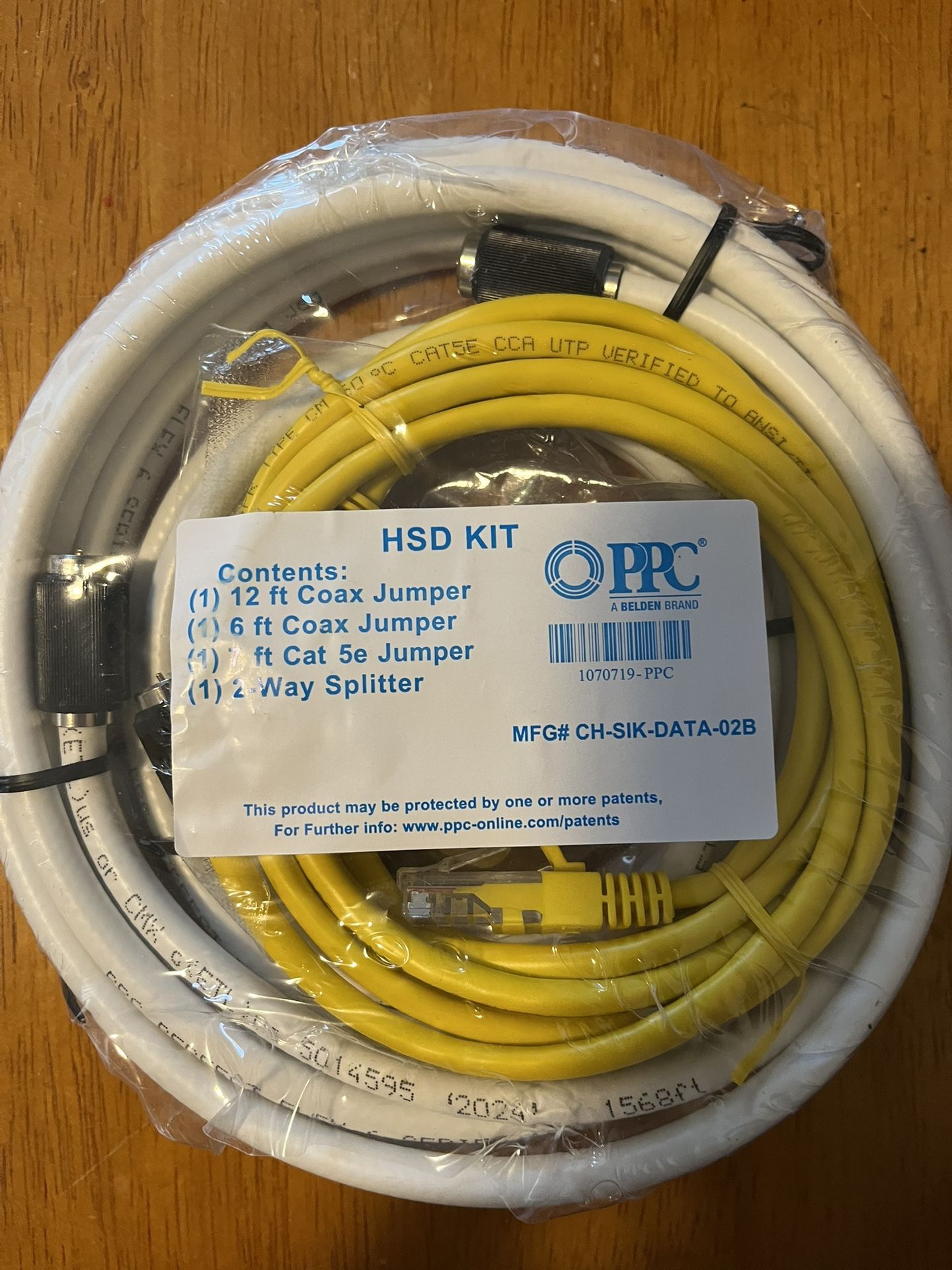 You can get this handy kit and have all your connection needs met. It includes a 12 ft coax jumper, a 6 ft coax jumper, a cat 5e jumper, and a 2 way splitter. It is all wrapped up in plastic, which is great.