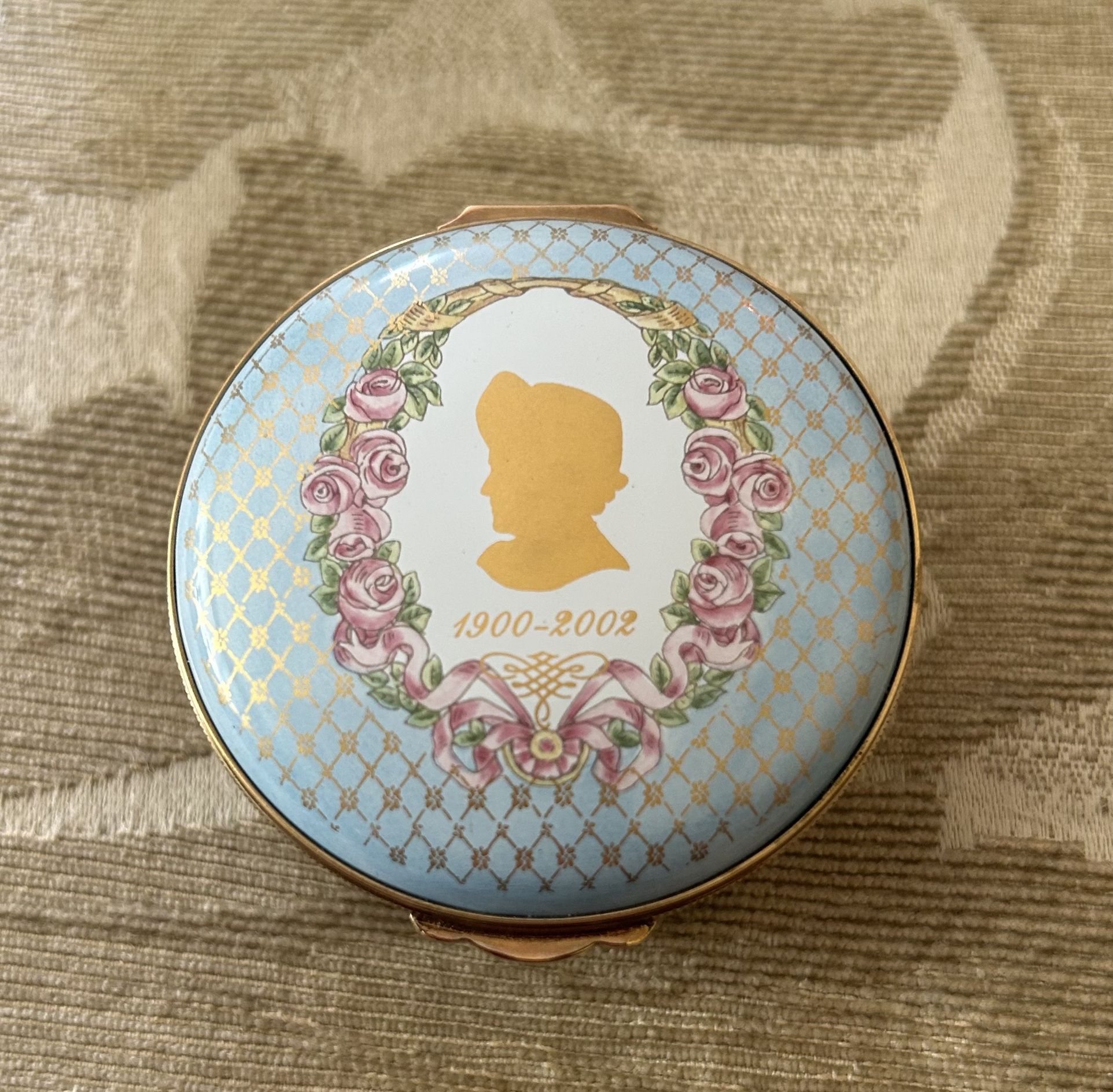 This box was issued in 2002 to celebrate the life of her Majesty Queen Elizabeth, the queen, mother, grandmother of King Charles III mother of Queen Elizabeth Elizabeth II She was very persuasive in Prince Charles, marrying Princess Diana. This is box number 1, making it very rare as they are only 101 boxes in the world. This box has sold for as high as $225 on eBay. It measures 2 inches round and 1 inch height Sorry, no original box This box is in excellent condition and it’s never been displayed and it’s been wrapped since purchased