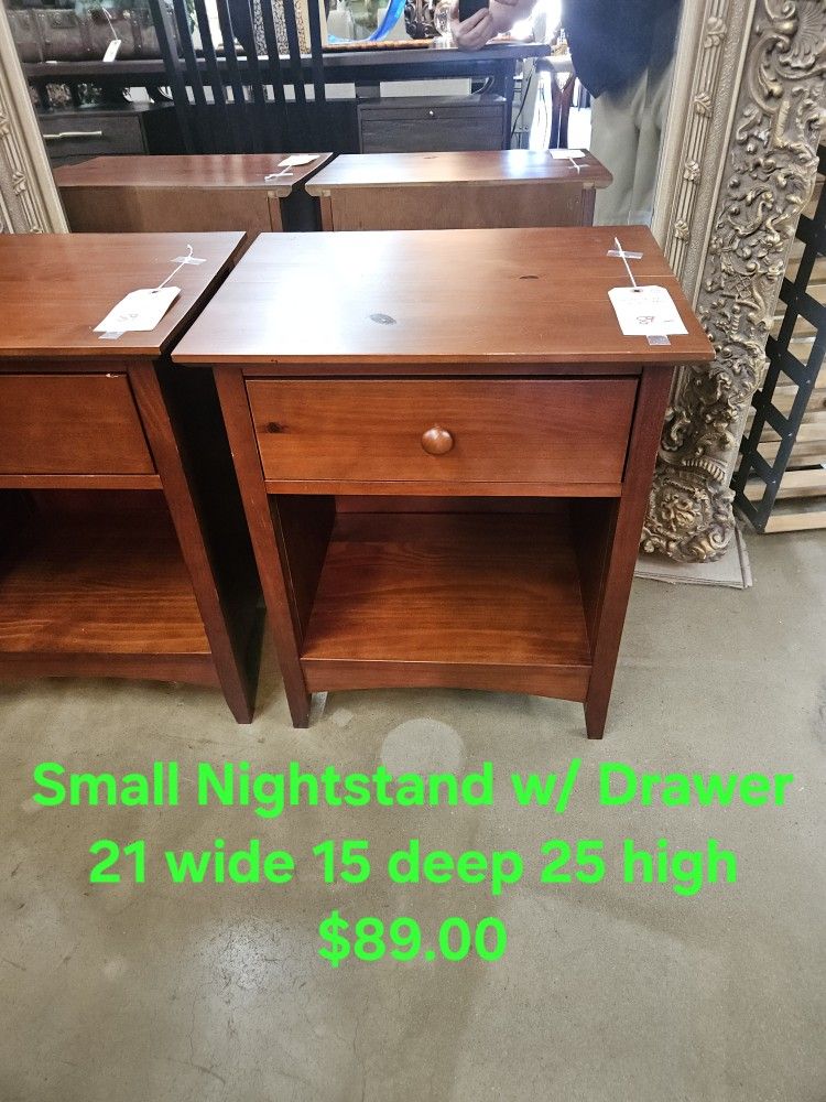 Nightstand 1 drawer. We have 2 available they 89.00 each Located at 2811 E. Bell Rd. Southside at the stoplight on Bell Rd. & 28th street Another Time Around Furniture aka Eclectica Home Furniture. We are open Wednesday through Monday 10 to 5 We are closed on Tuesdays Ask for Stephanie or Aaron. See our other items here also. We have 4 American flags on our front patio to help you find us, see the picture here. Follow us here and see all of the items in the store