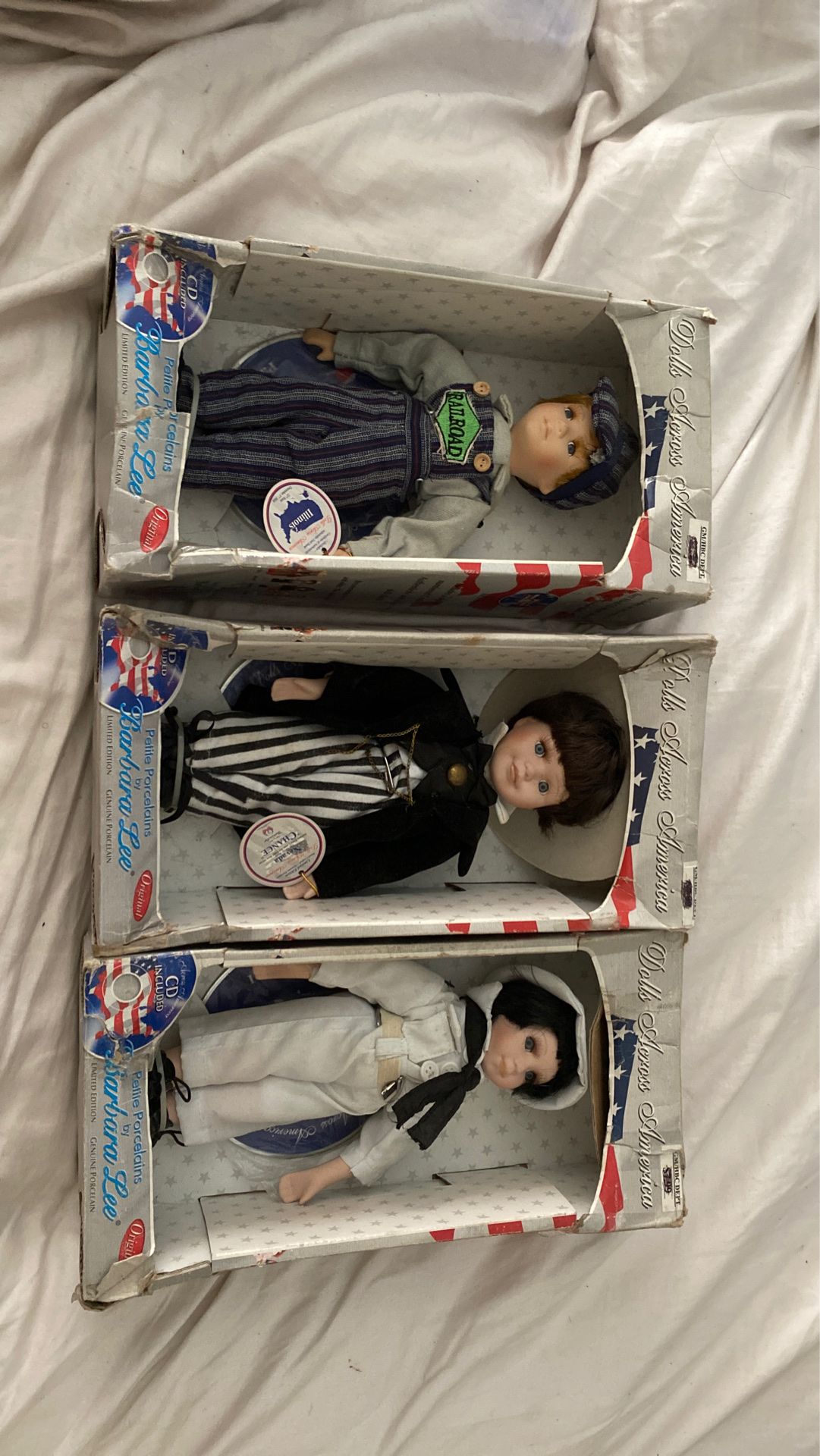 3 dolls across America boy dolls, passed down through 2 generations so they’re slightly old being moved around so much. Boxes have never been opened and dolls look great besides the boxes. $150 for all 3 but $40 for one!