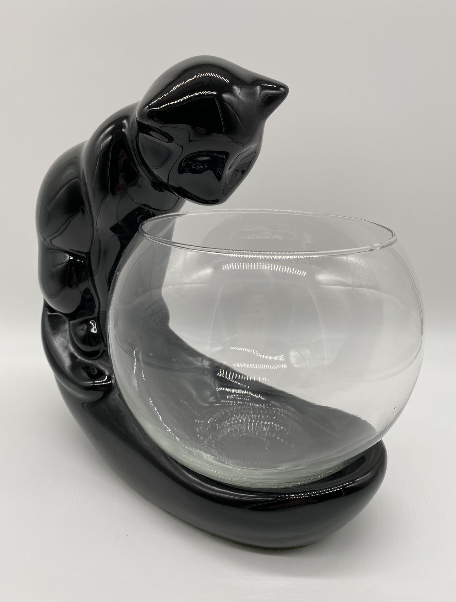 This black cat statue includes a small clear fishbowl so it appears the cat is watching the fish or whatever you put in the bowl. The bowl can be removed and it could also be used as a trinket tray, soap dish or small candle holder. The bowl is not original. The cat measures 8.5” long, 9” tall, 5.5” wide with bowl. It is in excellent condition with no chips or cracks. Pick up in Drexel Hill, PA or shipping available. Check out my other listings for more great items!