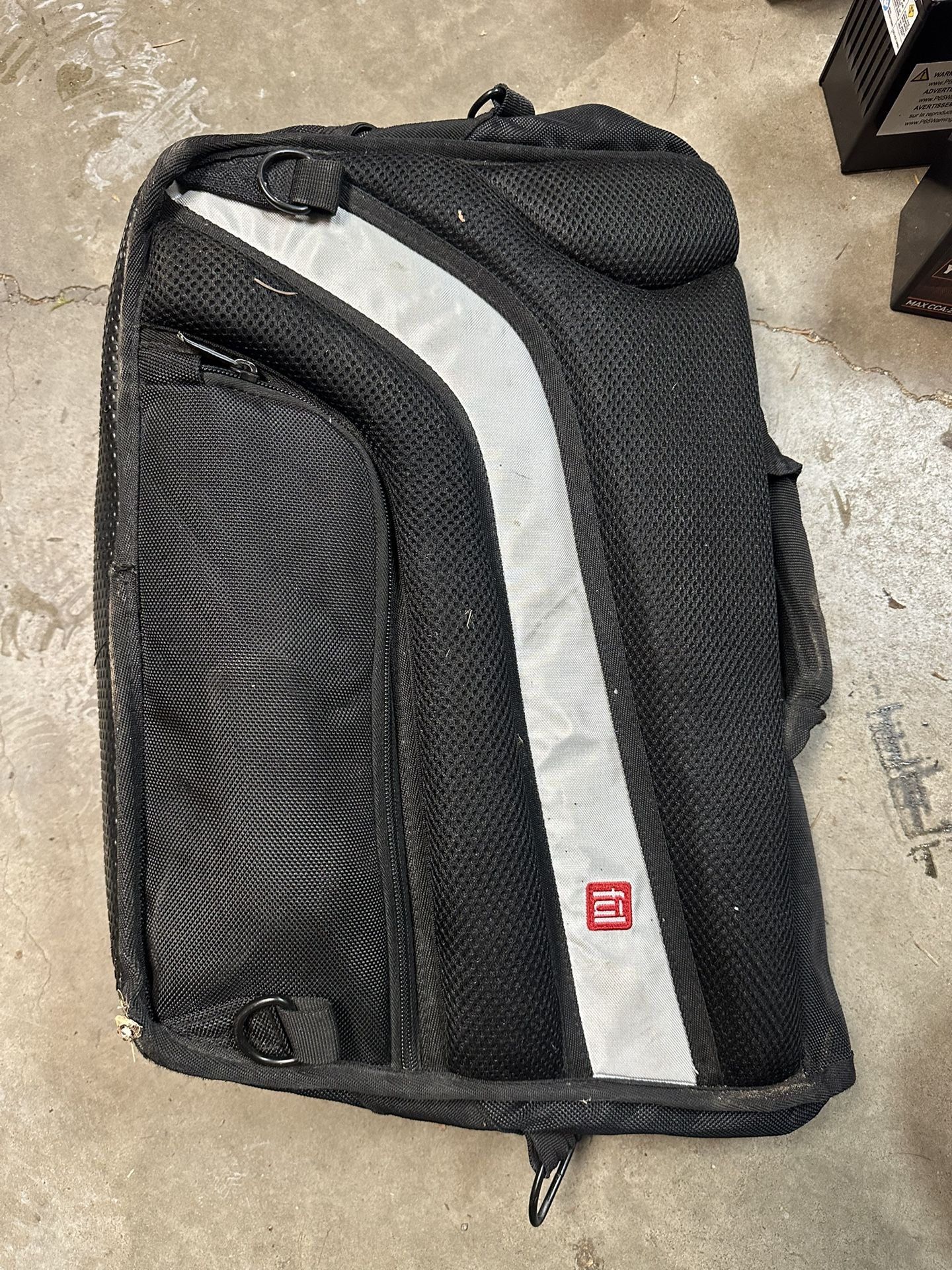 Black multi-compartment backpack with integrated Powerbag charging system. Includes internal battery and cables. Used, good condition.