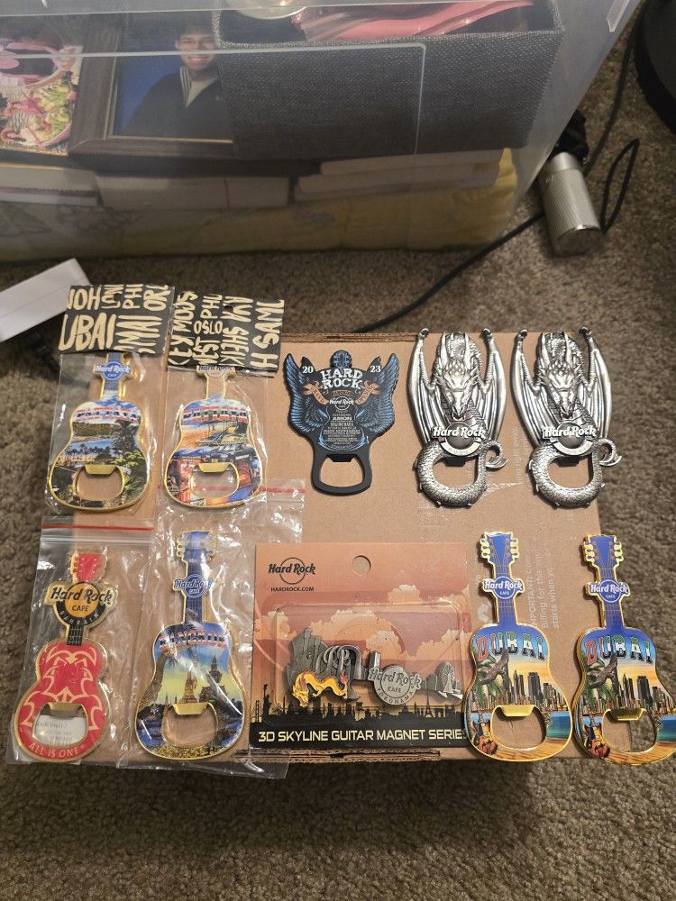 9 magnet bottle openers Hard Rock Cafe 1- Bahrain $10 2- Pattaya Beach (guitar) $15ea ($25 both) 2- Bangkok (1 guitar and 1 2023 grand opening) $10 guitar, $15 grand opening ($25 for both) 4- Dubai (2 guitar/2 Dragon) $15 guitar $20 Dragon ($60 for all) Free 3D Yokohama Japan skyline guitar magnet Or $80 for all $10-$20 ea