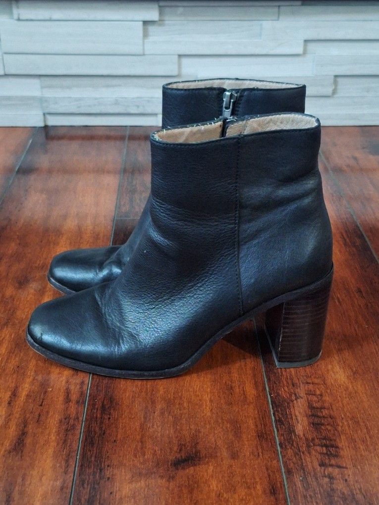 Madewell Black Leather Ankle Boots Size 7.5. Pre-loved, in good condition overall. Please see photos for wear.