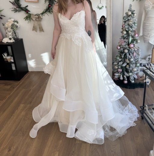 The original price is $4000. This dress was a sample dress at the store. I decided to wear a different dress for my wedding and have not taken the dress in for alterations. Wedding dress size 10. For reference, I wear a size 4 to 6 in normal dresses. This dress could fit someone size 4 to 8. If wanted, it can be tried on before purchase. Veil can be purchased with the dress for $100.