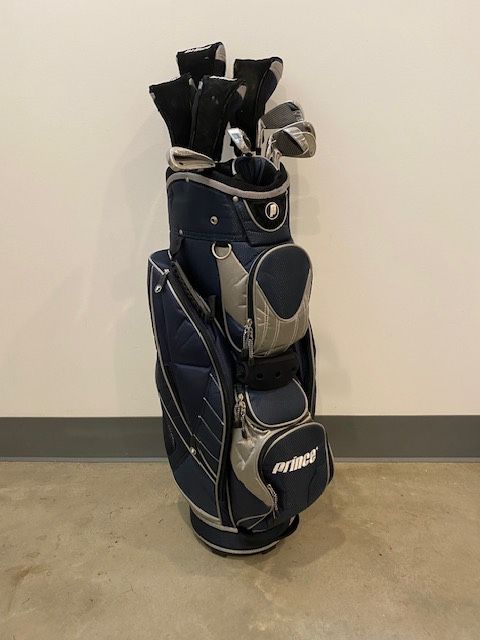Two “woods” 3 and 5 Two Hybribs 4 and 5 Irons 6,7,8,9,Pitching and Sand Wedge Prince cart bag NO DRIVER NO PUTTER $180