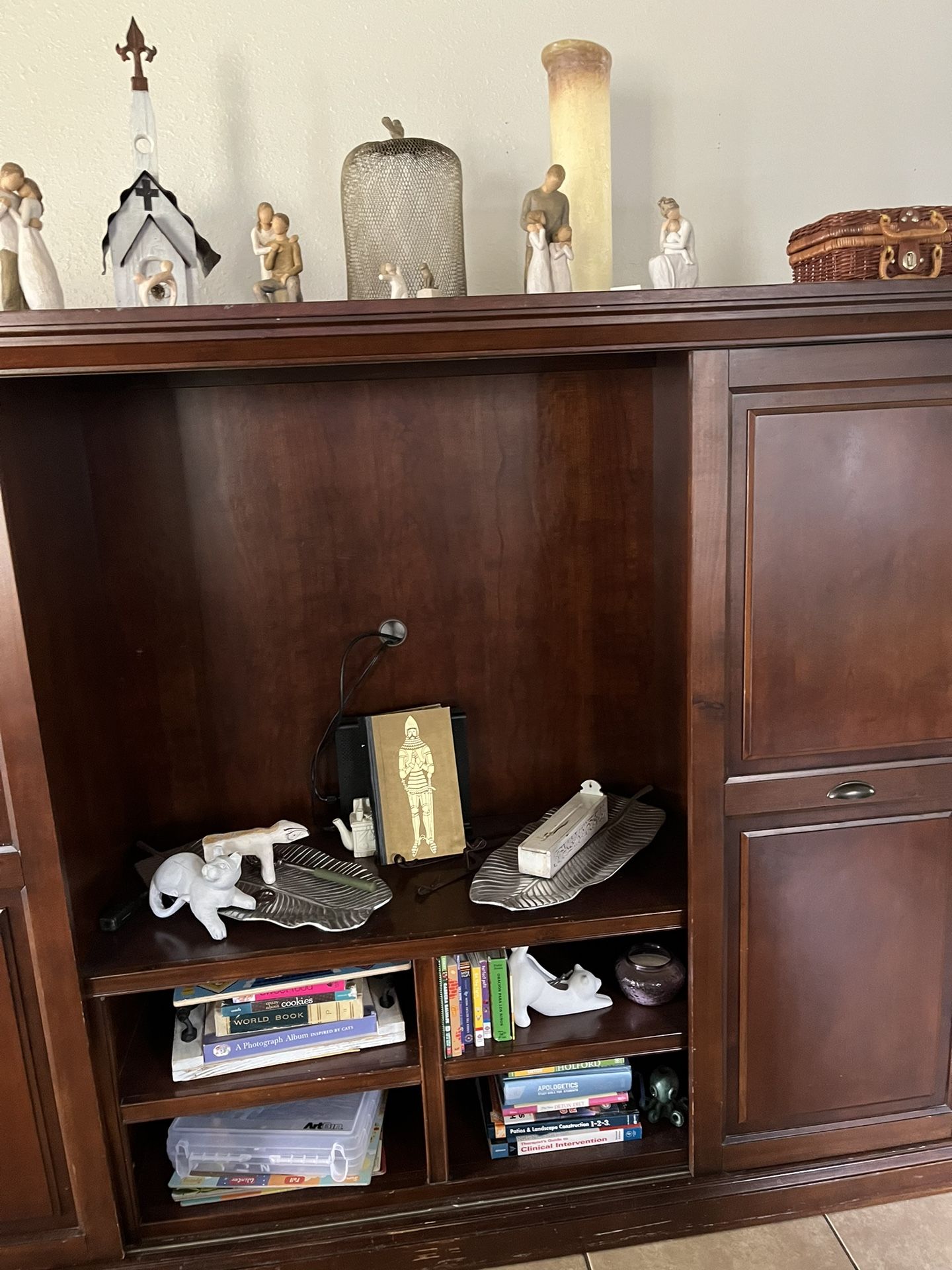 Great for storage bookshelves or family pictures it has holes on back to put the tv cables could also be use in a bedroom, if your interested must come prepared with a big truck and at least two strong guys very heavy