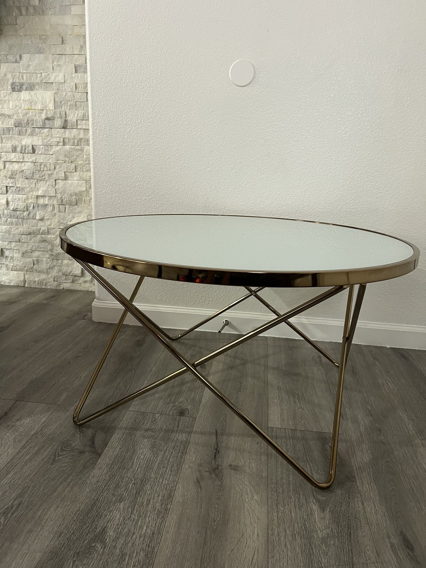 Is a round modern coffee table with a gold-tone metal base and a glass top (frosted or opaque white underside).