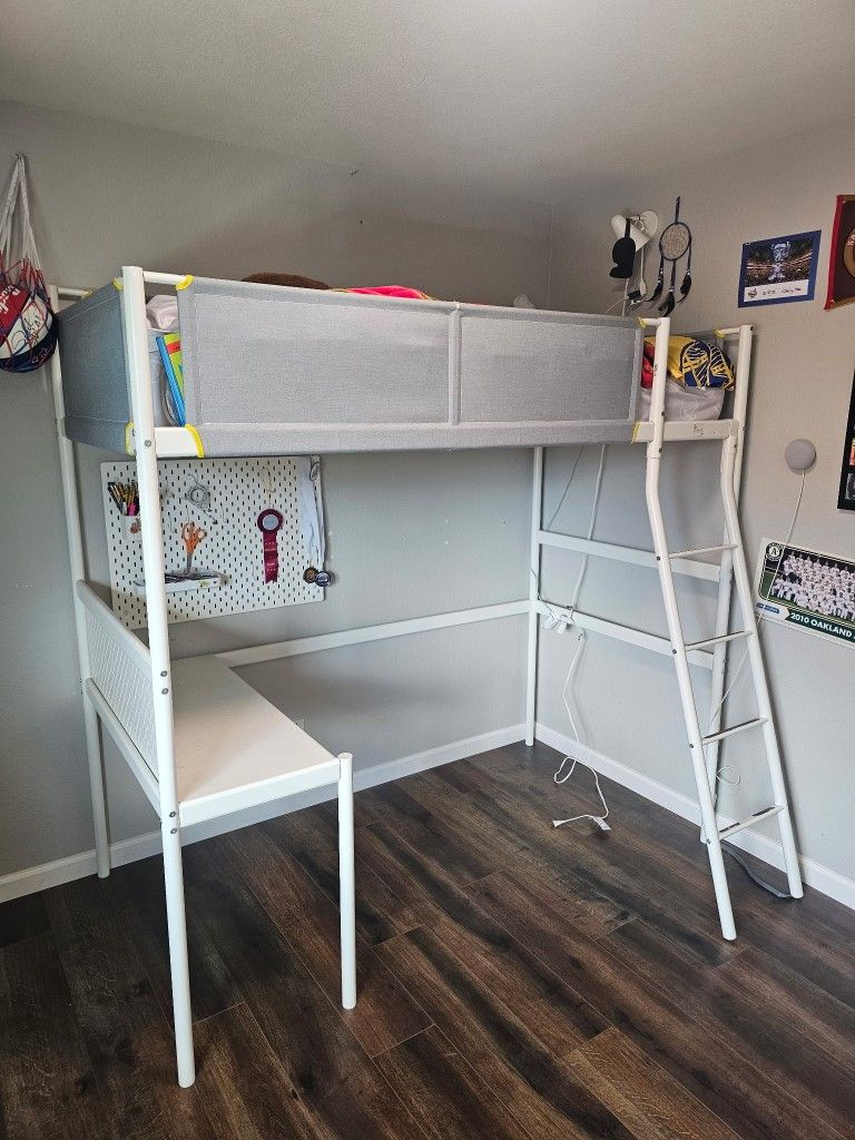 Selling an Ikea Vitval loft bunkbed with desk. Mattress not included. Broken down into 5 sections for moving. Can help load and discuss assembly. In great shape. All hardware included. No holds. Overall height to top of back rail = 76.5" Width = 41" bed + 15" for stair attachment Length = 78" Bed front side rails are 14" high Desk is 29" high x 16" deep Look on ikea website if you want any further measurements. This is a current model.