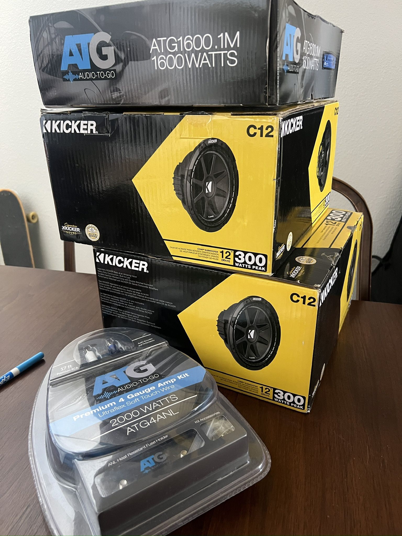 This is a brand new subwoofer kit including two 12" Kicker C12's, an amp, the necessary cables, and an enclosure. The packaging does have a few scuffs, but everything is unused. The enclosure (not pictured) is fit for the two subwoofers. I bought this kit a while back and never ended up using it.