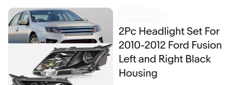 2 complete headlights, black housing. Never been taken out of box. I bought them for my Fusion then the car was never repaired so I dont need these headlights in my house anymore.