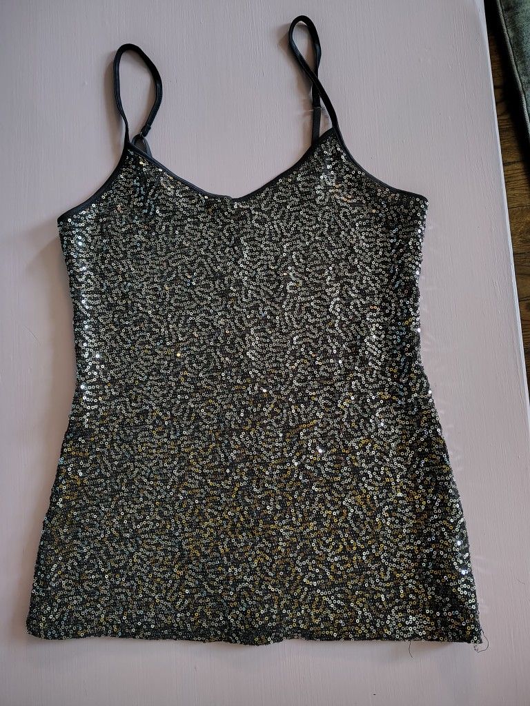 Size small but it's stretchy so can go up to medium. Express name brand. No missing sequins. Gorgeous.