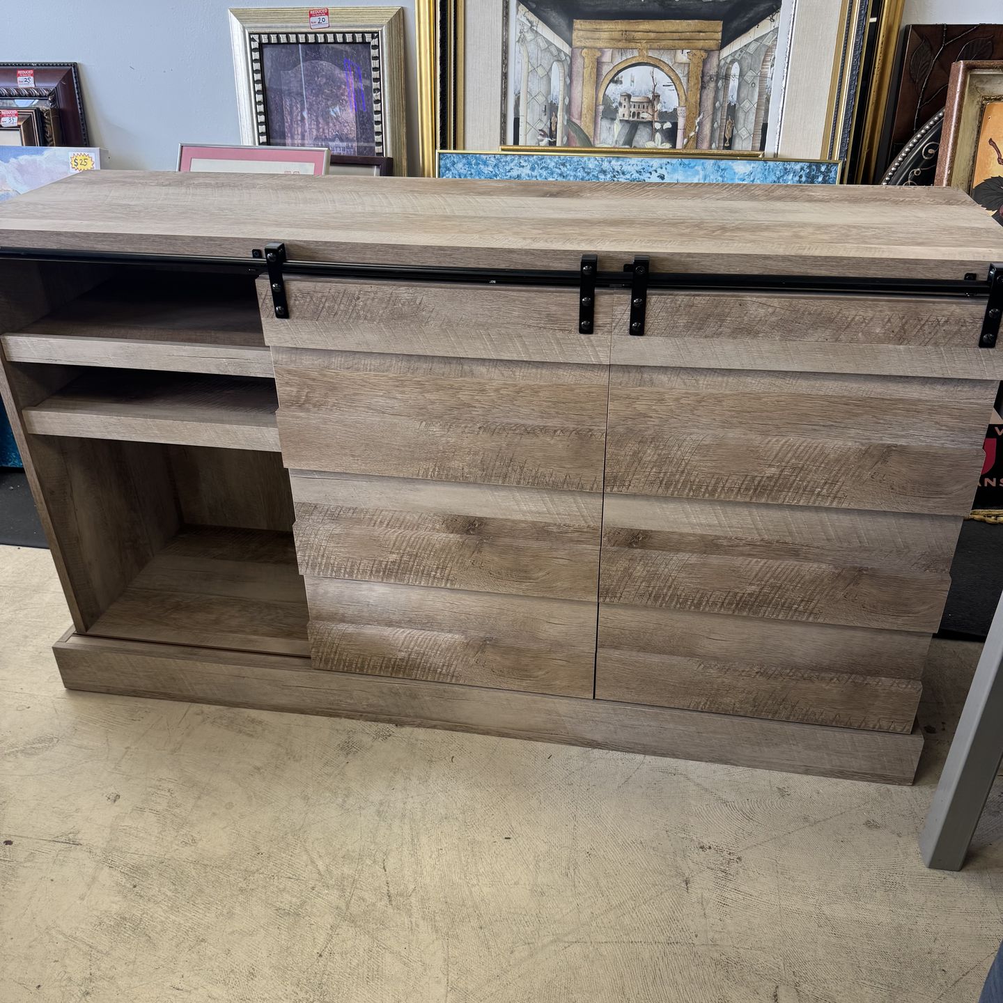 Beautiful solid wood credenza with farm house doors - 59” x 17” x 34” - Retail: $1095