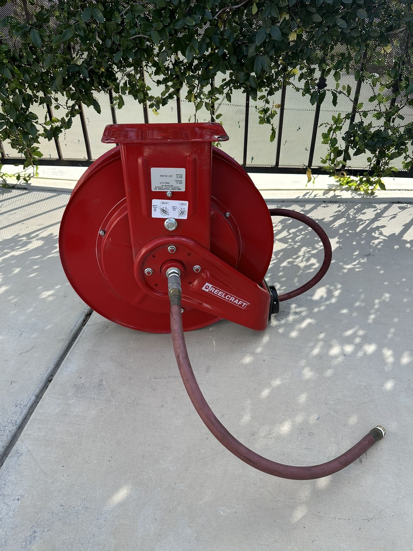 Selling my used Reelcraft 7650 OLP premium heavy-duty spring-retractable hose reel. This is the real deal — made in USA, super tough red steel build from the 7000 Series, perfect for garage, workshop, auto shop, air tools, or washdown. Key specs: • 3/8” ID x 50 ft low-pressure hose included (air/water rated, 300 PSI max) • Smooth spring retraction with quiet latch • Adjustable guide arm (multiple positions) • Reinforced dual pedestal base for solid mounting • Weighs about 43 lbs — built like a tank! Price $195 Located in Eastvale Park