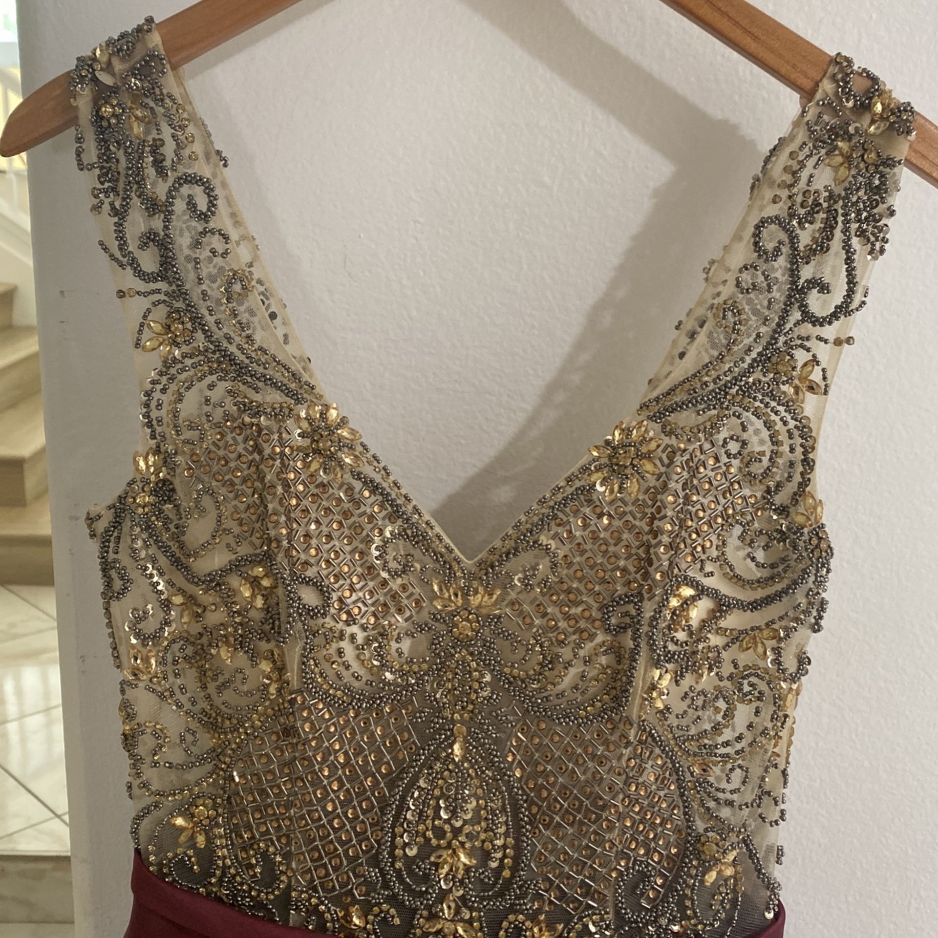 Size 6 burgundy and the top is ivory mesh material with gold and gun metal detail it is in excellent condition it also has tull underneath to give it a fuller look over all a beautiful dress I used for my daughters wedding