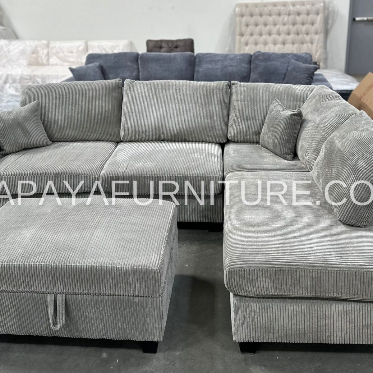 New! Plush Gray Sectional, Sectional And Storage Ottoman, Sectionals, Sofa, Couch, Gray Couch, green Couch, Corduroy Sectional, USB Charger Sofa Dimensions 106”L x 76” chaise Brand new set Delivery service is available Financing Program Available with Snap/ ACIMA