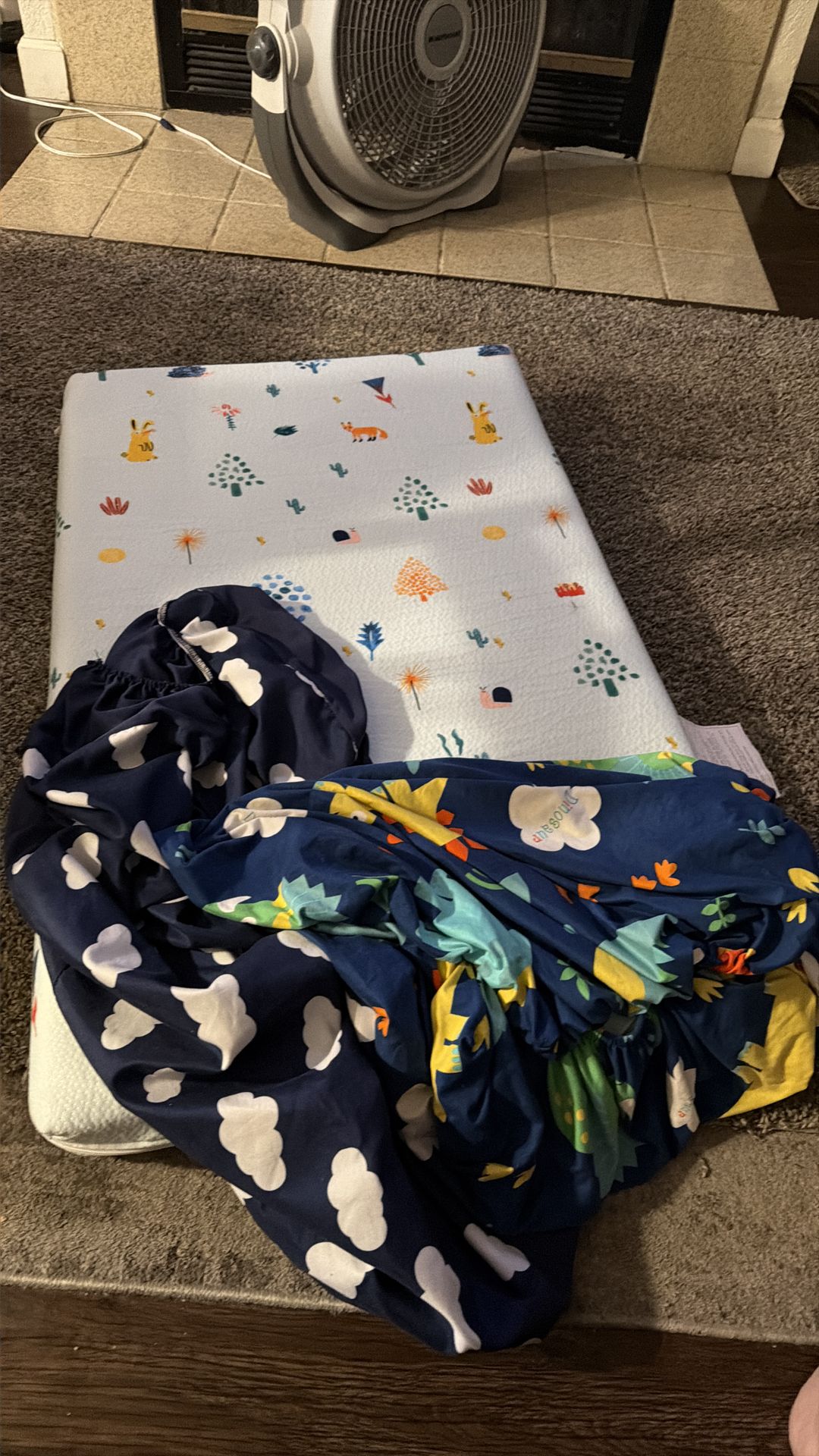 Mini crib mattresses have probably be used in a playpen. Also has a protective cover and two sheets that’s on the mattress the one that has the animals and the fox on it is a protected cover can be taken off to be washed. I just washed it and the sheets in great condition.