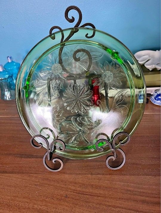 Jeanette glass uranium glass cake stand. No chips or cracks Pick up only, thank you Check out my listing, great deals!