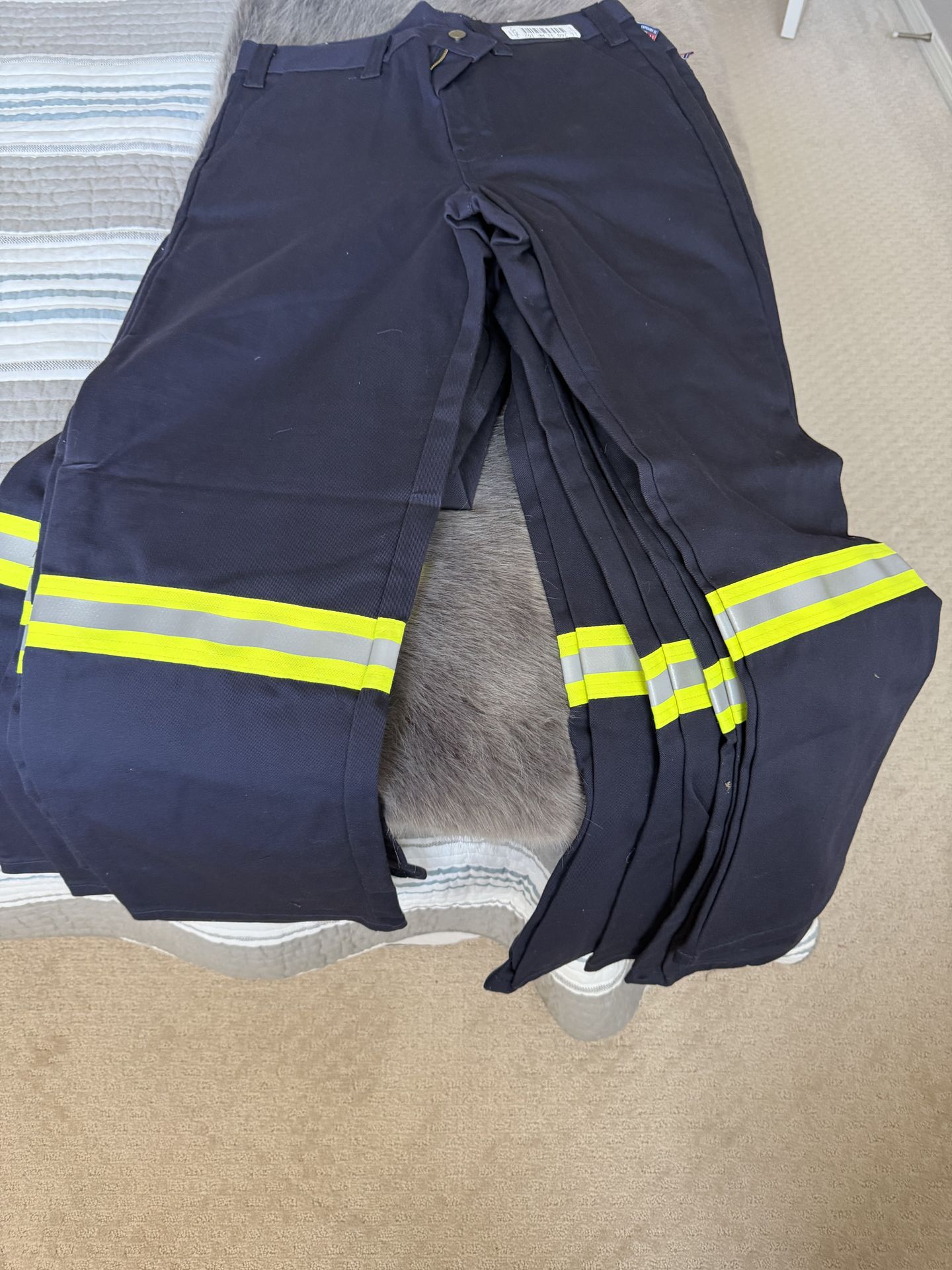 $30 each or all 5 for $125 Size 36x30 Sits at waist Regular fit in seat and thigh Slightly tapered leg Nomex® taped brass zipper and button front closure 2 front slash pockets 7 belt loops 2 back welt pockets with loop and button closure on left side Using Nomex® thread serge and single stitched on all seams High resistance thread Bar-tacked at all stress points Flame-Resistant Reflective Material placement provides Enhanced visibility with a horizontal stripe around each leg