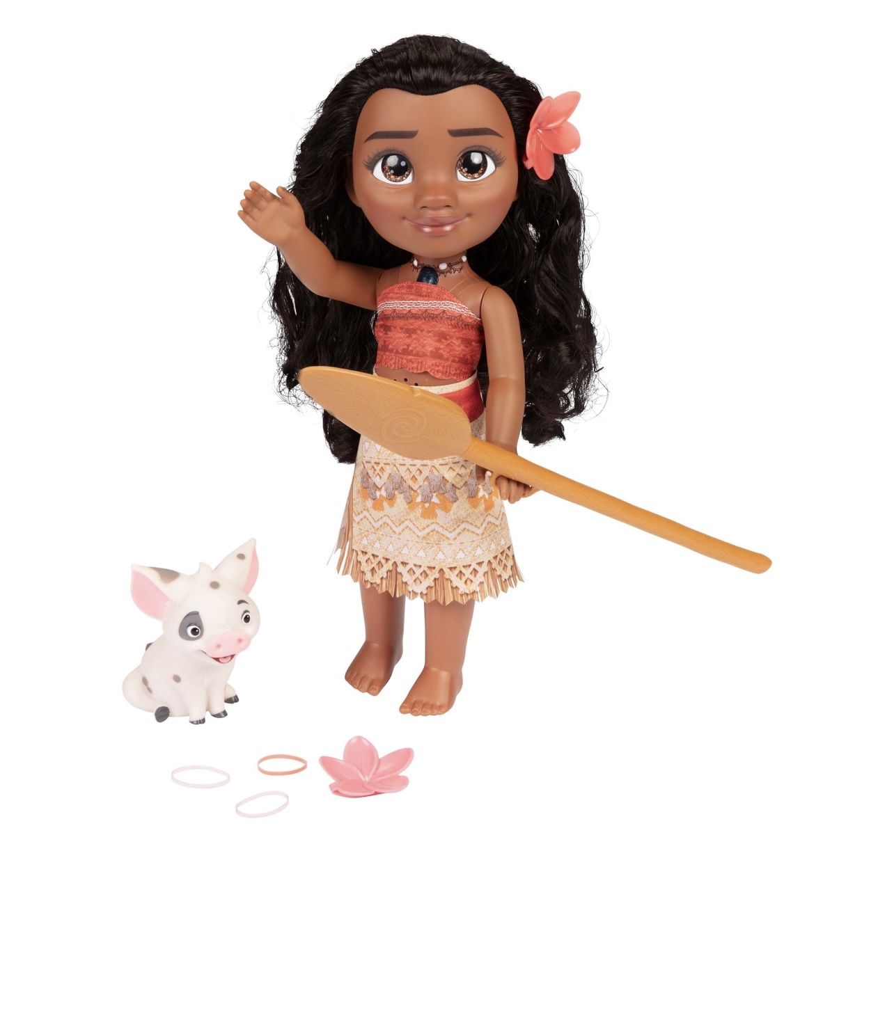 Sold out in store Bring it Celebrate the story of Disney’s Moana with this amazing My Singing Friend Moana & Pua doll! Your child's favorite Disney Princess Moana is dressed in her iconic adventure outfit, ready for any seafaring excursion! Just like in the movie, Moana’s necklace lights up! Join Moana and her best pal Pua on daring and fun adventures! Perfect for children ages 3 and up! MUSIC, LIGHTS, AND PHRASES: Moana sings “How Far I’ll Go”, says over 10 story-inspired phrases, and her iconic necklace lights up! STORYTELLING ACESSORIES: Accessorize you and your friend Moana’s hair with the beautiful hair clips and elastic bands! Complete with Moana’s oar, you’ll have everything you need to join Moana & Pua on an action-packed adventure! FOR KIDS 3 YEARS OLD AND UP: My Singing Friend Moana & Pua doll makes a great birthday gift or holiday present for any Disney Princess fan! INCLUDES: 1 Moana Doll, 1 Doll Outfit, 1 Doll Oar, 2 Flower Hair Clips, 3 Elastic Bands and 1 Pua Figure Large Doll stands at 14” Tall