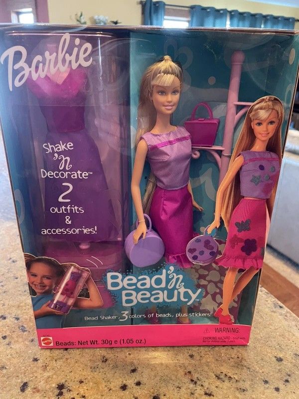 Bead 'n Beauty Barbie Doll with Bead Shaker & Stickers 2001 Mattel #52745 Bead it and make it beautiful! 1. Design with stickers! 2. Choose your bead color! 3. Decorate with beads! More than 45 stickers you can decorate! Use decorated stickers again and again. Create lots of cool looks! Choose blue, purple or pink beads Shake 'n Decorate 2 outfits and accessories! Contents: Doll, dress, shoes, purse, wardrobe, 2 double sided adhesive sticker sheets, 3 colors of beads and instructions