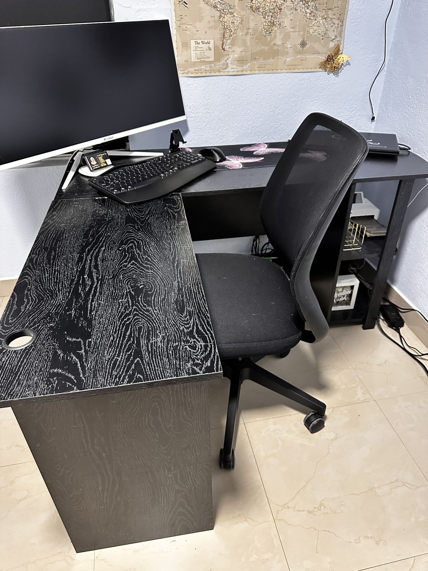 Selling a sleek black L-shaped desk with matching office chair. Space-saving corner design Sturdy and stable Built-in shelving for storage Cable management hole on desktop Clean and well maintained Chair included Dimensions: 51.5” x 51.5” 28.4” height Perfect for a home office, student workspace, or business setup. Great for dual monitors, laptop setup, or work-from-home use.