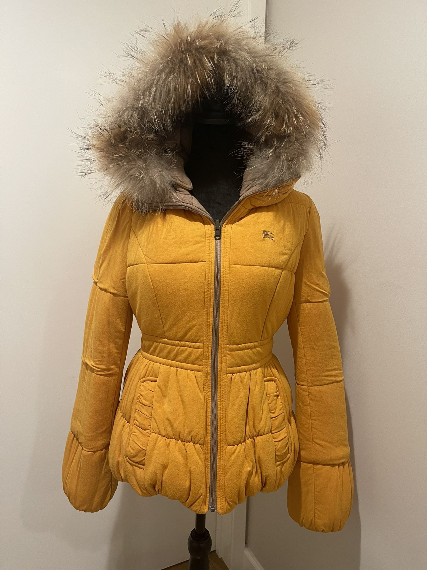 Burberry jacket Size 38 / Medium Reversible jacket Yellow & brown color Zippered with 2 pockets Removable hoodie Removable fur In excellent condition