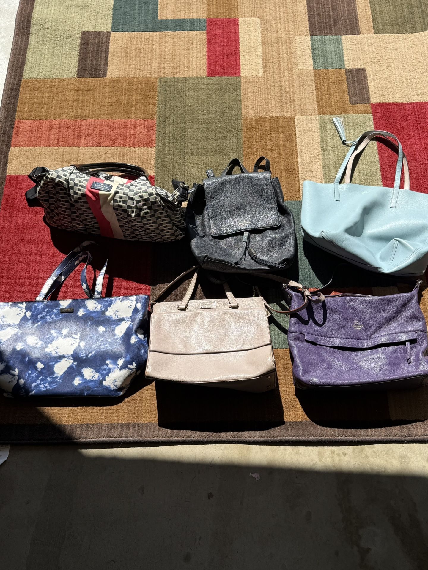 Each bag is Authentic Kate Spade. Never worn. Each at $35. If it is still on this list it is still available. 1. Coated textile shoulder bag 2. Black leather backpack / purse 3. Light blue leather Tote 4. Grant Street Jules Grainy Leather Cloud Blue & White Leather Tote 5. Crossbody Ivory Pebbled Leather Bag 6. Plum Purple Pebbled Leather Bag