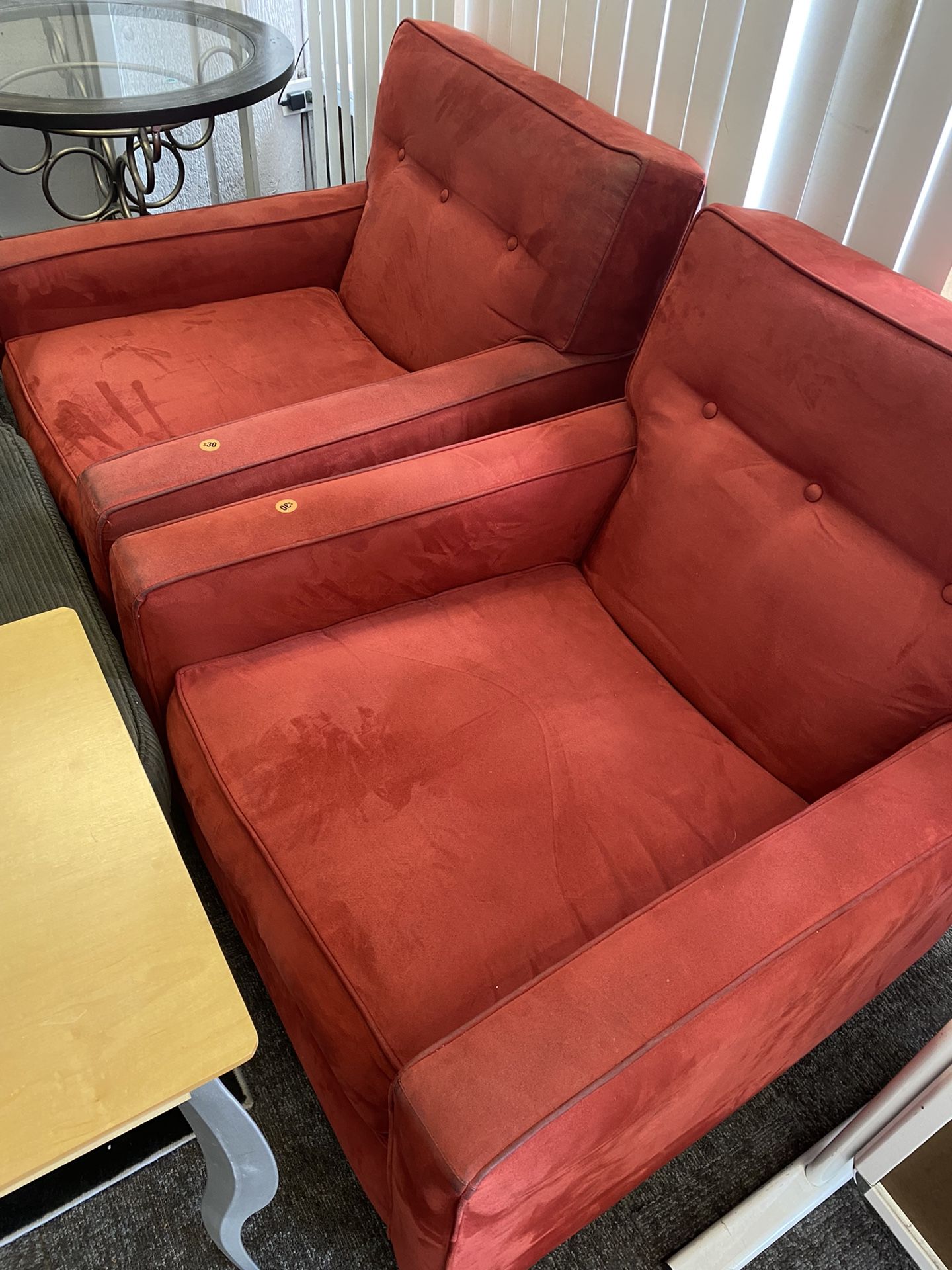 Red accent chairs. Needs cleaning on the arms. They are super comfy and sturdy.