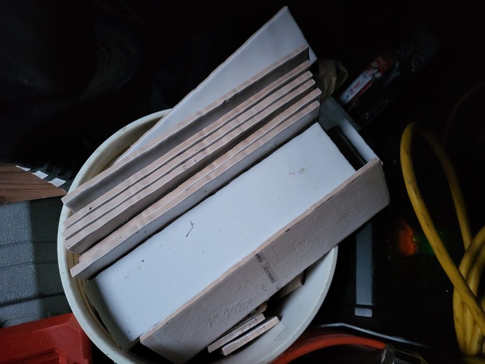 Whole bucket filled with white backslash or edge tile. And brand new bucket of tile adhesive
