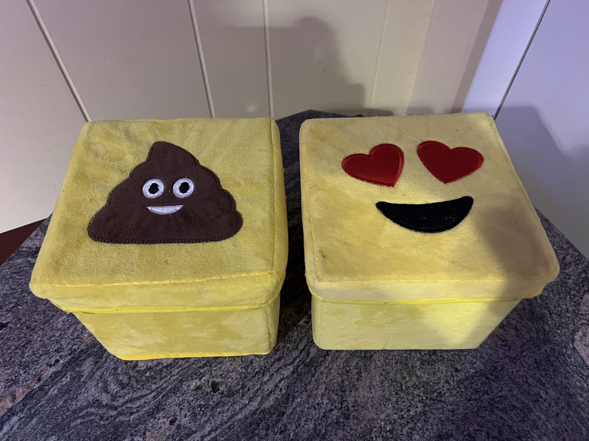 Poop emoji and heart eyes emoji soft storage containers. Size is approximately 6”. $5 for both.