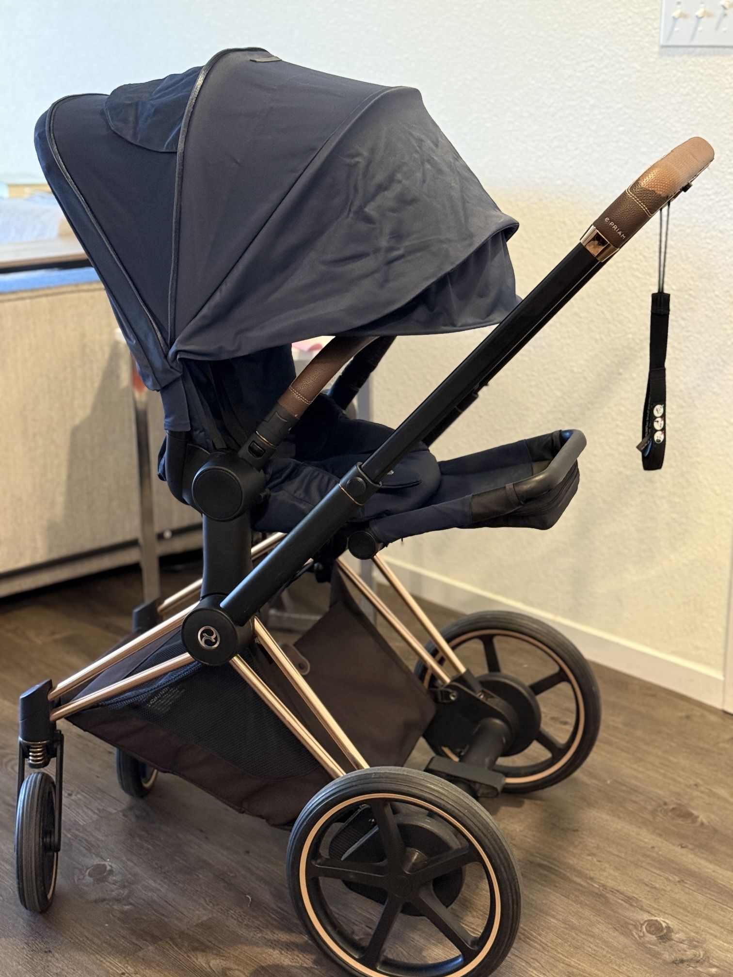 Selling our Cybex e-Priam Electric Stroller in a dark navy (almost black) color. This is a premium smart stroller that makes walks way easier: • Electric assist helps you push uphill and on tougher terrain • Downhill safety: the stroller brakes/controls speed when going down • Hands-free rocking mode (gently rocks to help soothe baby) • Phone app control (smart features + settings) • Not sun-faded / no discoloration • Includes car seat adapters (ready for travel system setup) Condition / Note: The only issue is the handlebar grip has some peeling/wear (not leather) — visible in photos.