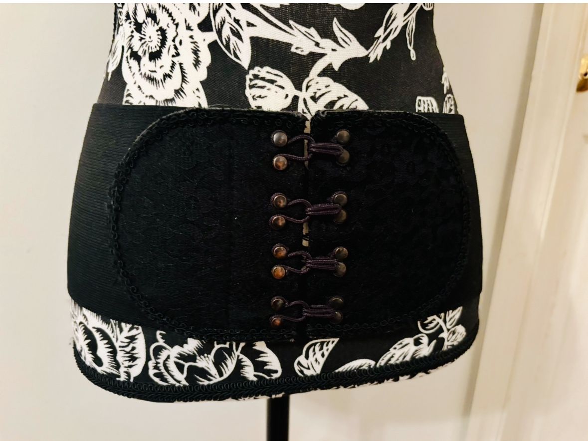 Wide elastic belt for woman. 39” long without stretching, 50” long when stretching. 5” high. Lace in the front. Cones from a smoke free environment.