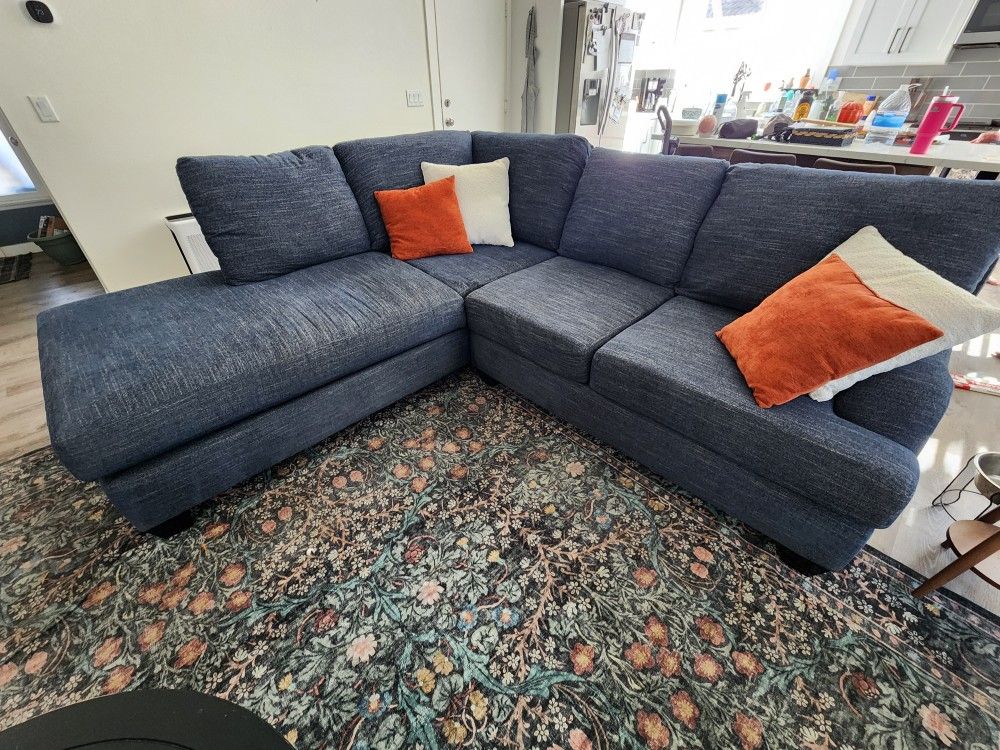 Living Spaces Sierra Foam couch with long chaise. Custom ordered and very well taken care of, in like new condition. 99" wide, 94" long on the chaise end and 39" deep on the standard couch side. Curious Eclipse color. Comes with two extra cushions and one extra cushion cover. No rips, no tears, no stains. Only selling because we're moving and it won't fit in our new space. Paid $1900 new. $600 obo.
