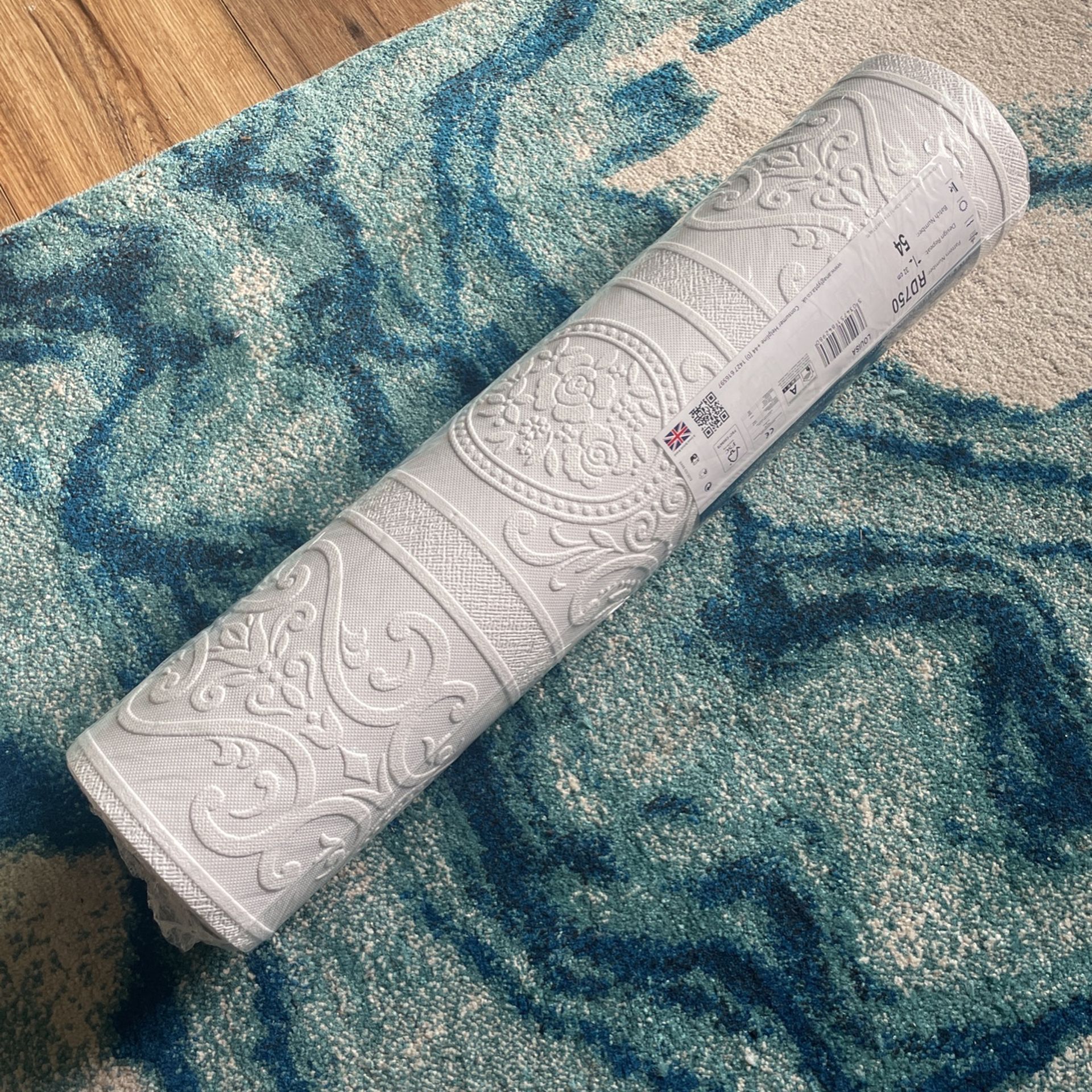 Brand new- never opened. Designer and modern day looking wall paper roll. Dimensions: Roll dimensions: 53 cm x 10.05 cm (5.3m squared)/21x 11yard