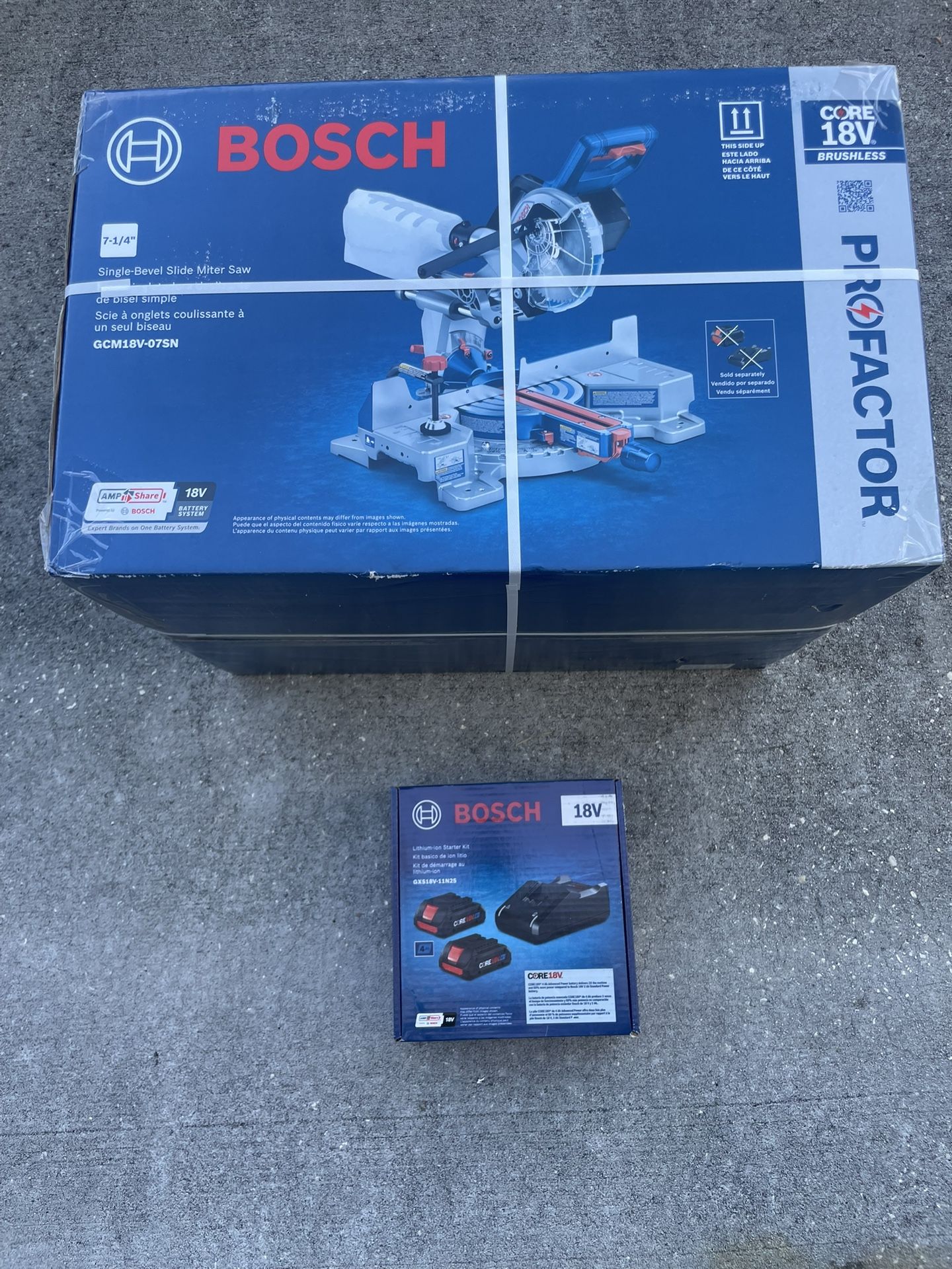 New never open Bosch Profactor 7-1/4in 18v Miter Saw and 18v 2Pack Lithium 4ah Battery Kit
