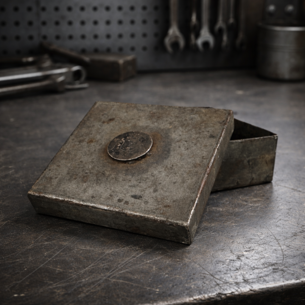 Unique vintage handmade steel box featuring an authentic 1943 Australian Florin coin embedded into the lid. The coin displays the Australian coat of arms with kangaroo and emu flanking the shield beneath a crown. The box is constructed from thick steel with visible hand-worked edges and aged industrial patina. Pieces like this were often crafted as mid-20th century keepsake or workshop boxes, sometimes referred to as trench art style objects. A distinctive industrial collectible suitable for: • Coin display • Desk trinket storage • Industrial decor • Curio cabinet display The embedded Florin coin dated 1943 adds historical interest and character to this one-of-a-kind metal box. Brand: Unknown Type: Handmade metal box Material: Steel Coin: Australian Florin Coin Year: 1943 Origin: Coin Australia / box origin unknown Era: Mid-20th century Style: Industrial / trench art style vintage steel box industrial box trench art florin coin australia coin coin lid box metal trinket industrial decor handmade steel vintage metal