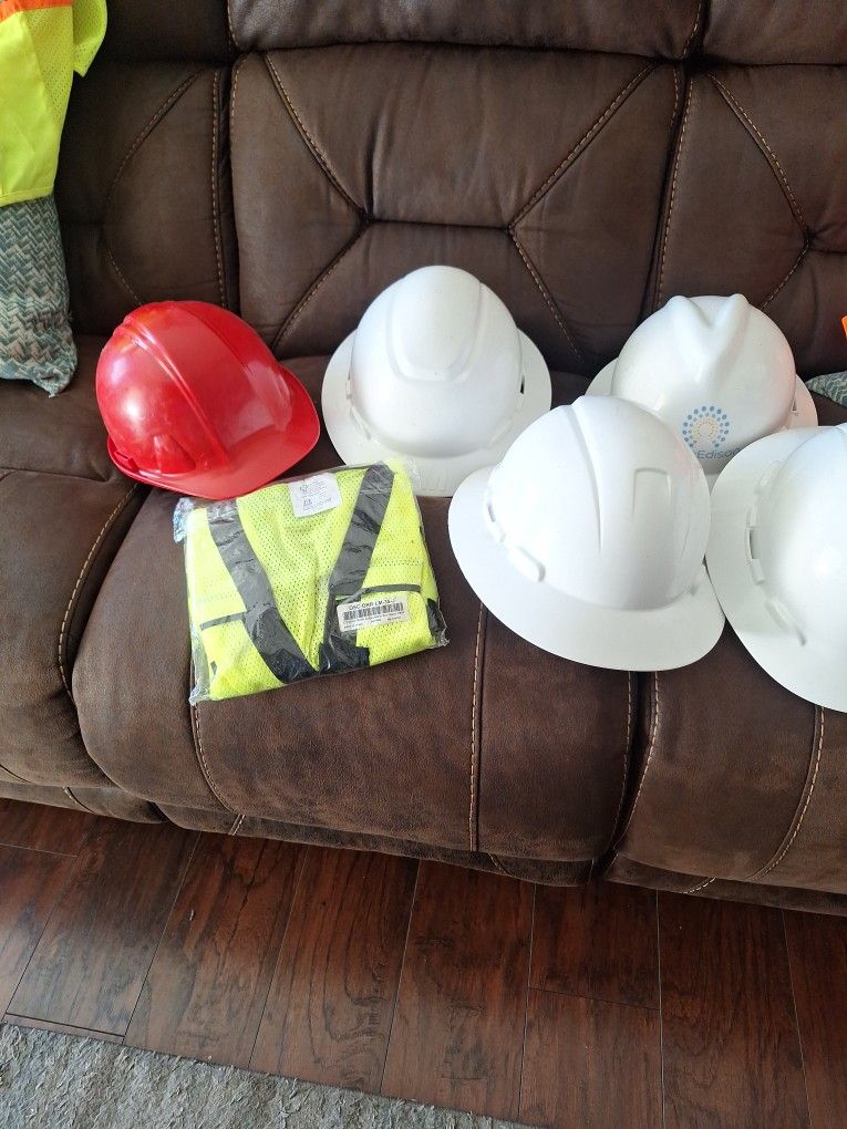 5 HARD HATS AND 2 NEW SAFETY VESTS all FOR 35 OR 7 DOLLARS EACH